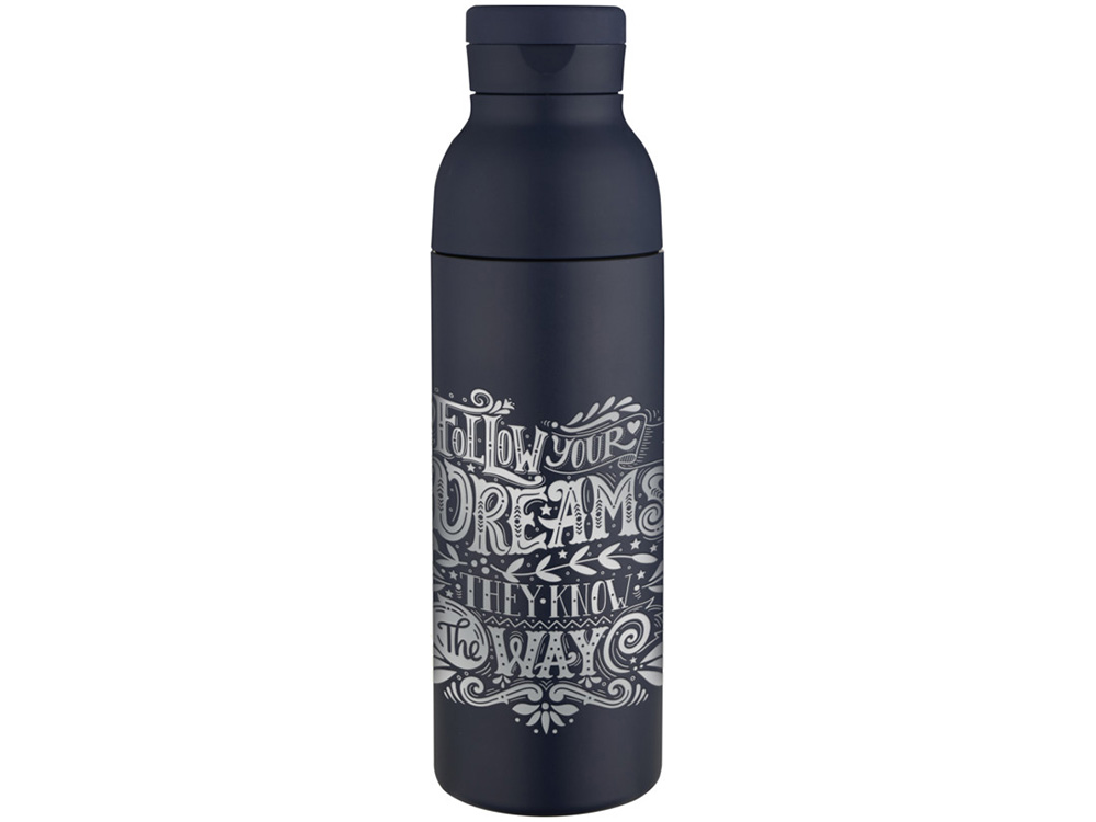 В этот подарочный набор входит бутылка объемом 650 мл с двойными стенками и вакуумной изоляцией, изготовленная из сертифицированной согласно RCS нержавеющей стали с медным покрытием для лучшего поддержания температуры.