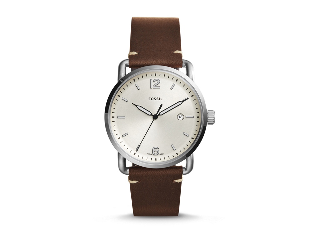 Товар представлен в следующем цвете: Корпус- серебристый, циферблат- кремовый, крепление- коричневый