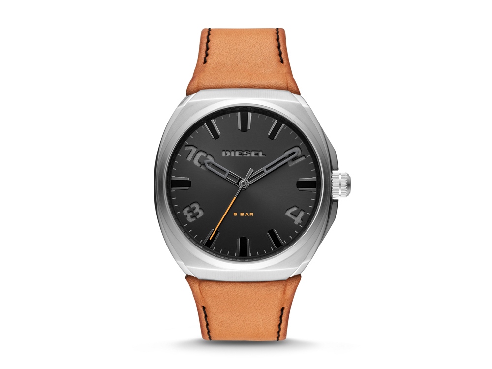 Товар представлен в следующем цвете: Корпус- стальной, циферблат- серый, крепление- коричневый