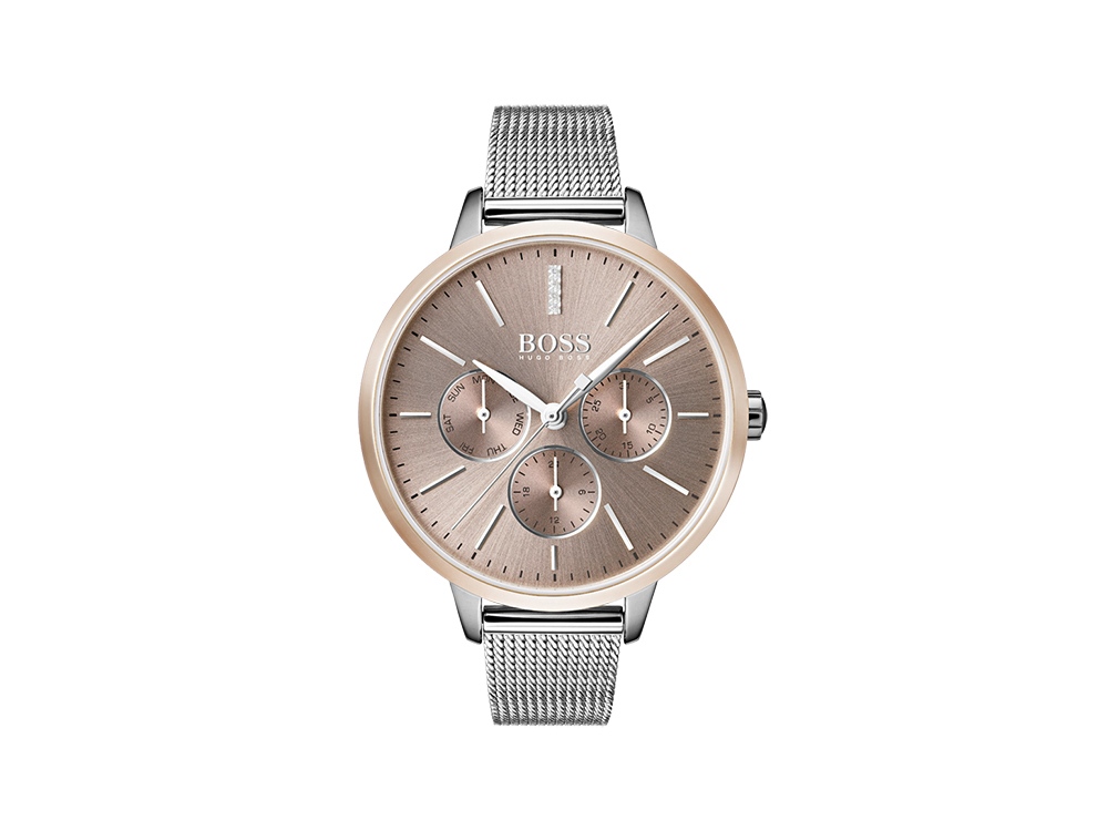 Многофункциональный кварцевый механизм (день недели, дата, 24 ч), D=38 мм, толщина корпуса 9 мм, корпус и меш-браслет из нержавеющей стали (316L) c IP покрытием, минеральное стекло, циферблат sunray, водозащита 30 м.