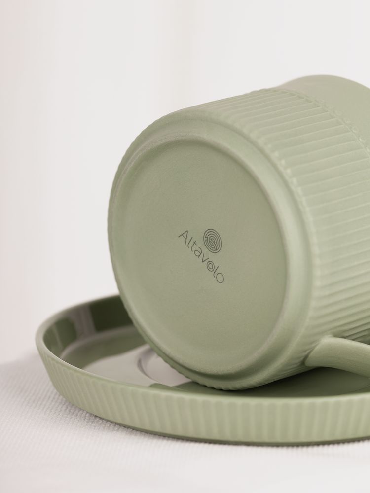 Орнамент корпуса кружки и высокого бортика блюдца напоминает изящные каннелюры — вертикальные желобки на колонне. Это добавляет всему изделию изысканности и стилистической завершенности, благородства и античной строгости.