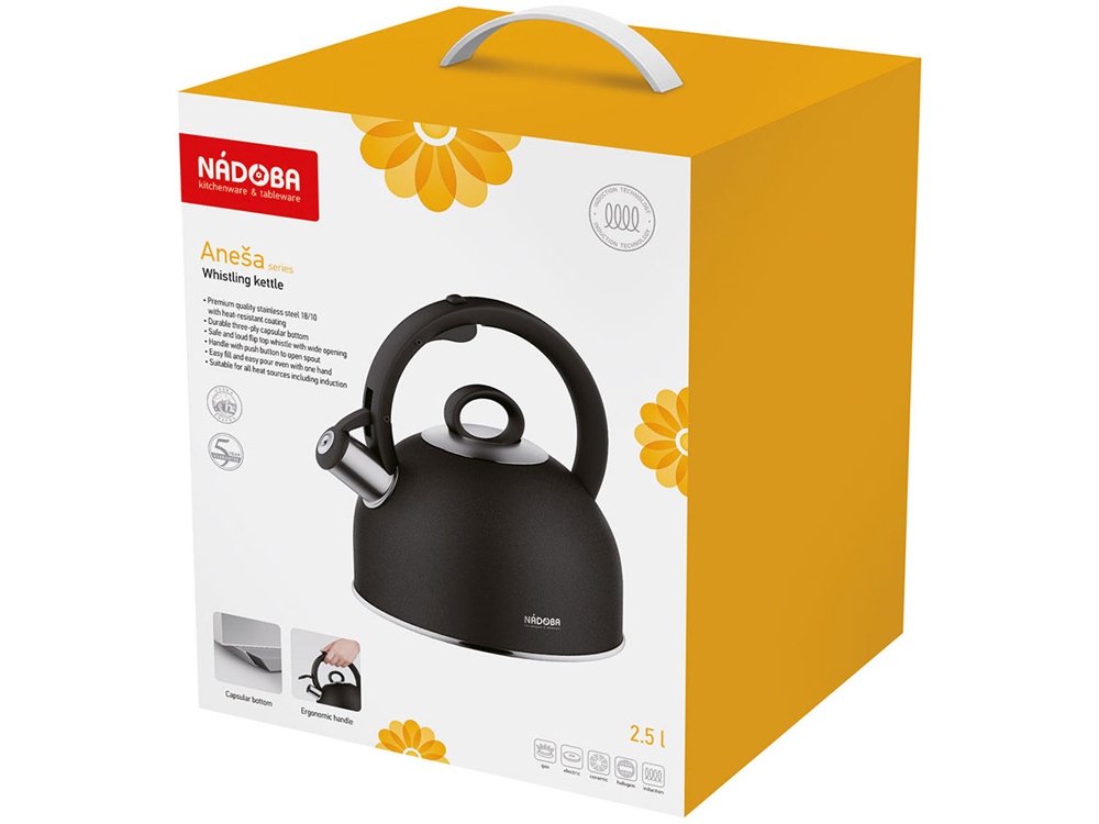 - Чайники серии Anesa изготовлены из высококачественной нержавеющей стали 18/10. В серию NADOBA Anesa входят чайники объёмом 2,9 и 2,5 л.