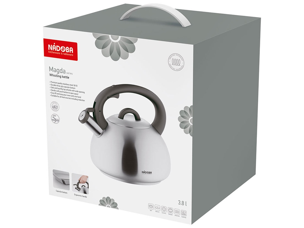 - Чайники серии Magda изготовлены из высококачественной нержавеющей стали 18/10. В серию NADOBA Magda входят чайники объёмом 3,8 и 2,8 л.
