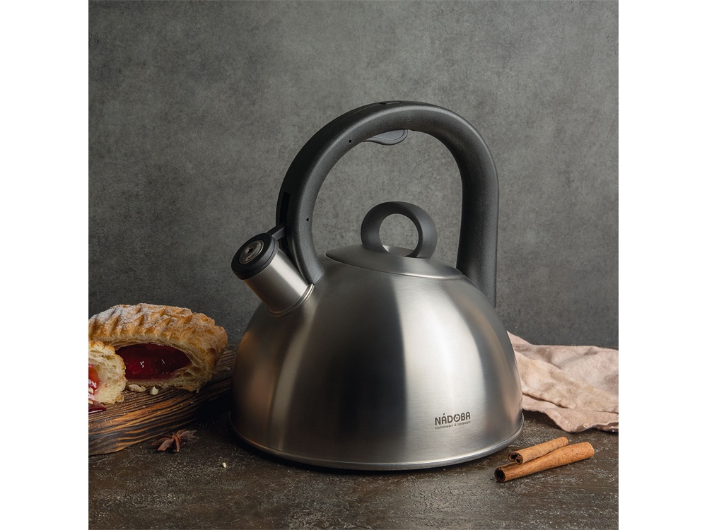 - Безопасный и громкий широко открывающийся свисток позволяет наполнять чайник через носик, не открывая крышку, и вовремя проинформирует, что вода уже вскипела.