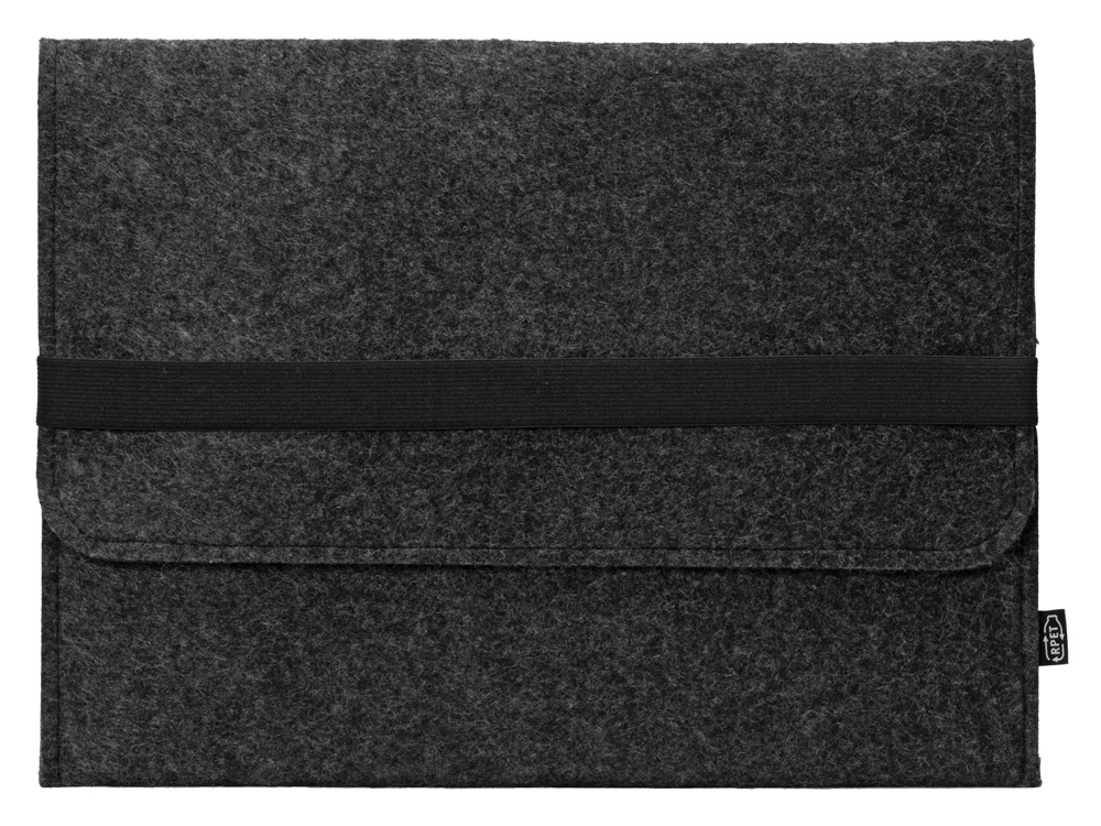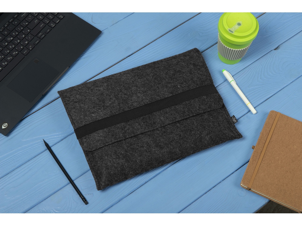 Чехол для ноутбука выполнен из фетра толщиной 3 мм. С передней стороны расположен органайзер размером 13x27 см для канцелярских принадлежностей, карт и телефона. Чехол фиксируется в закрытом виде с помощью эластичной ленты.