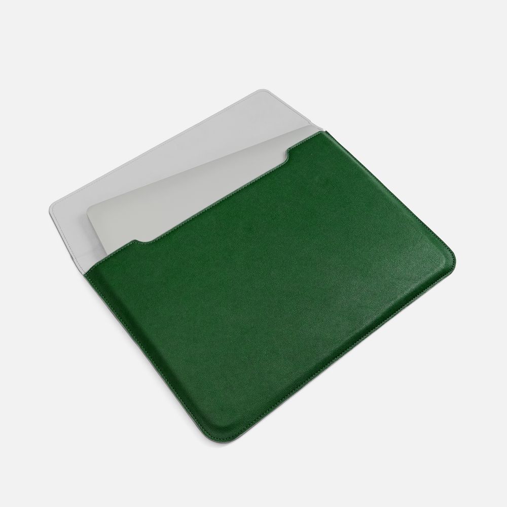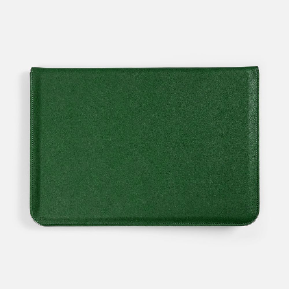 Чехол для ноутбука с диагональю до 15,6 выполнен из материала Petrus, зеленого цвета, дополнен окрашенным срезом края серого цвета.
