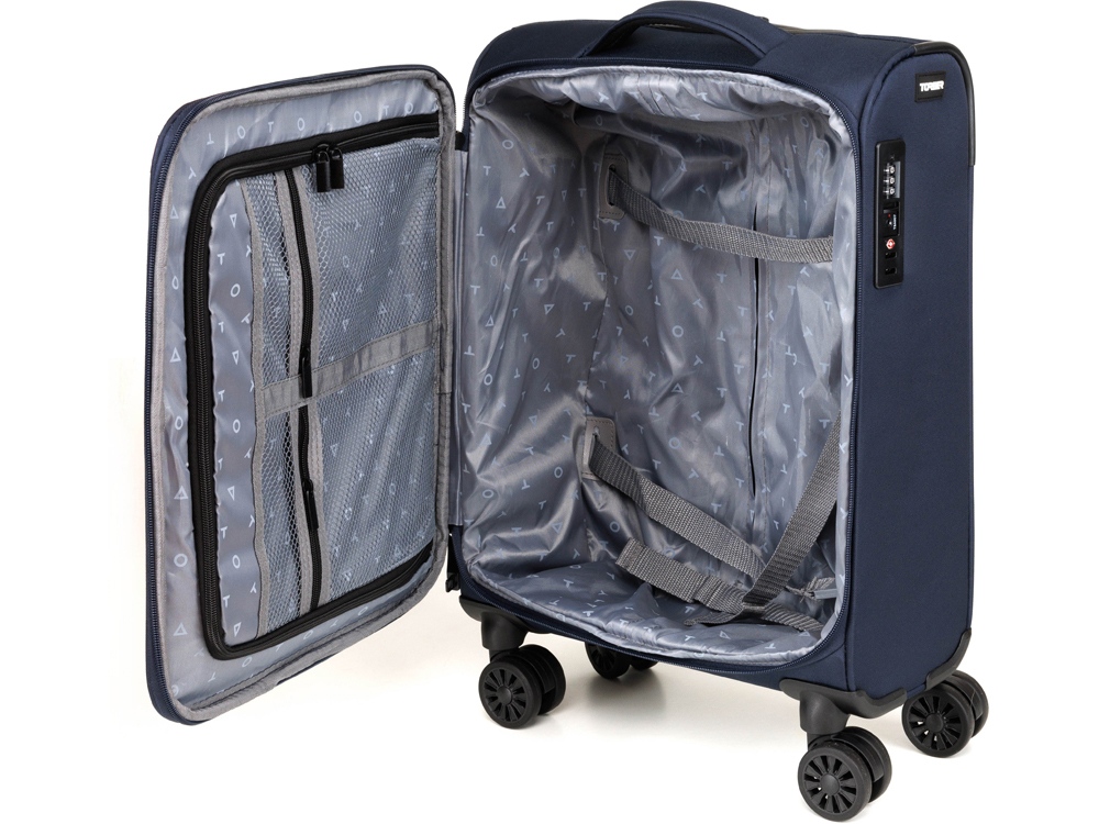 Чемодан полностью раскрывается на 2 отделения, с перегородкой на молнии и ремнями для надежной фиксации вещей на месте.
