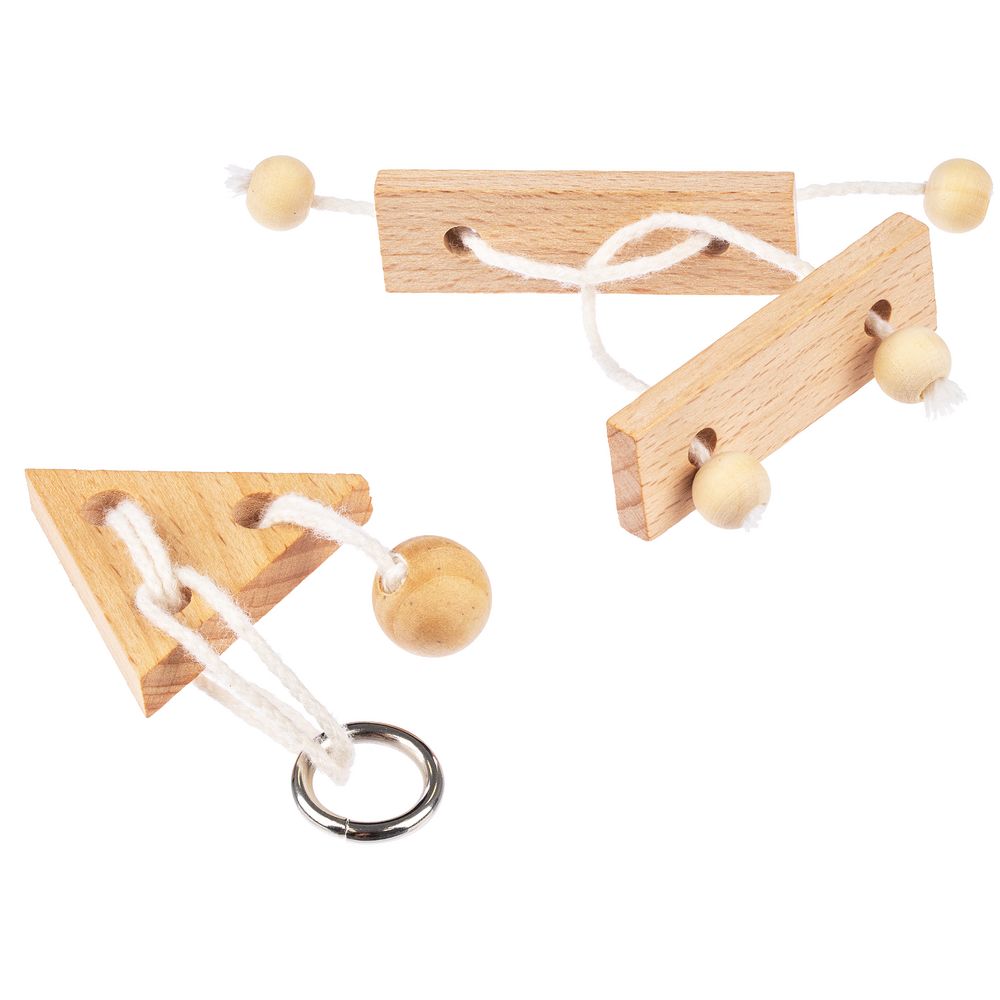 Миниатюрная головоломка Combi из натуральных материалов. Задача головоломки — разъединить ее элементы, не развязывая веревку.
