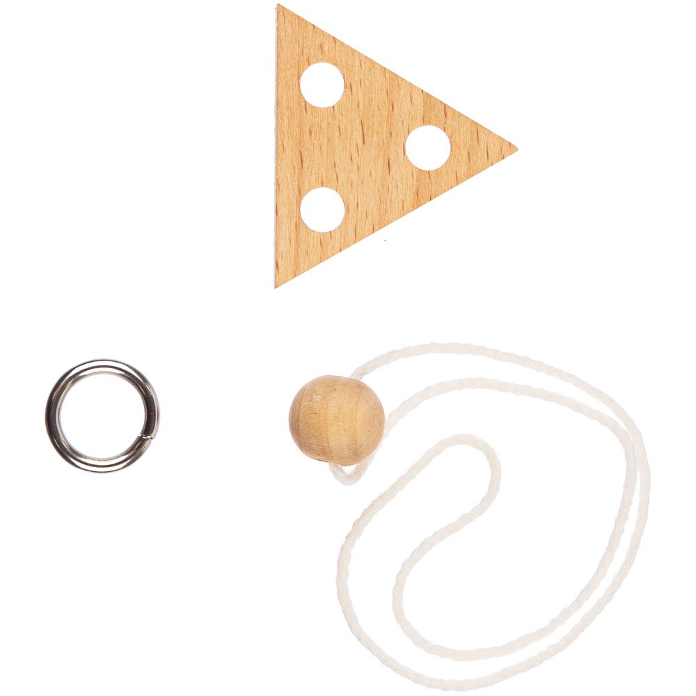 Миниатюрная головоломка Combi из натуральных материалов. Задача головоломки — разъединить ее элементы, не развязывая веревку.