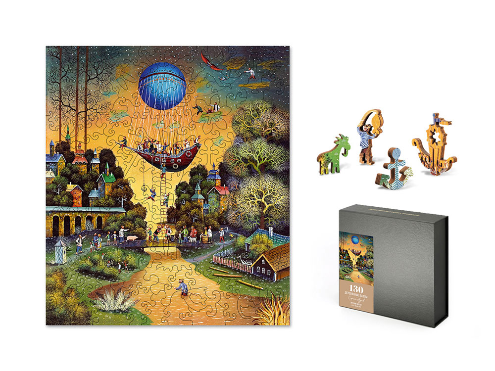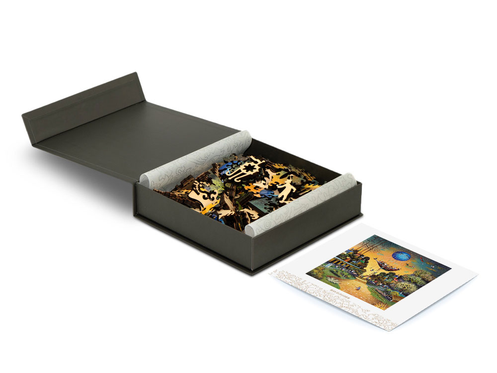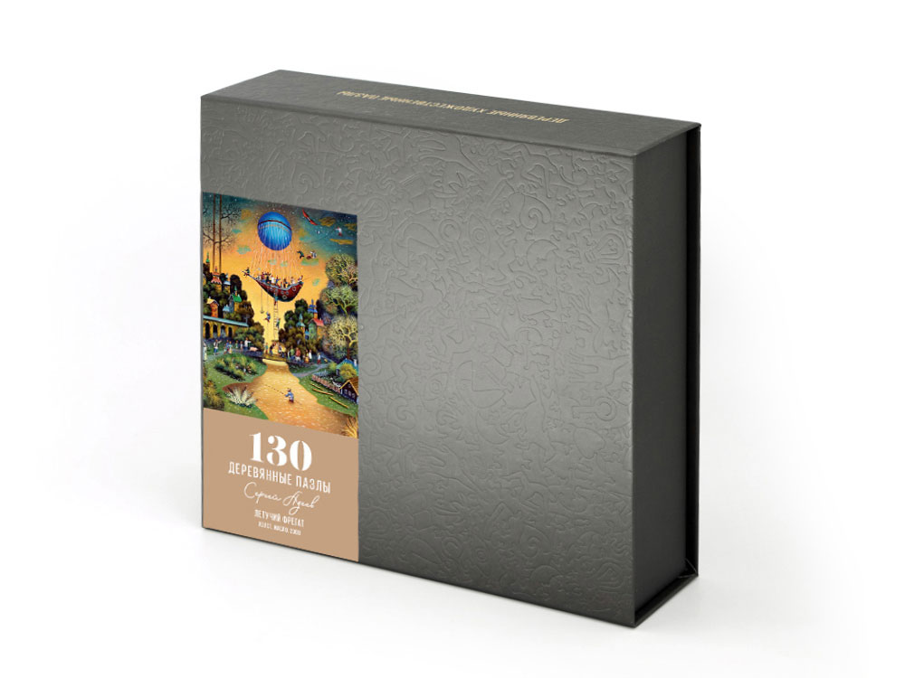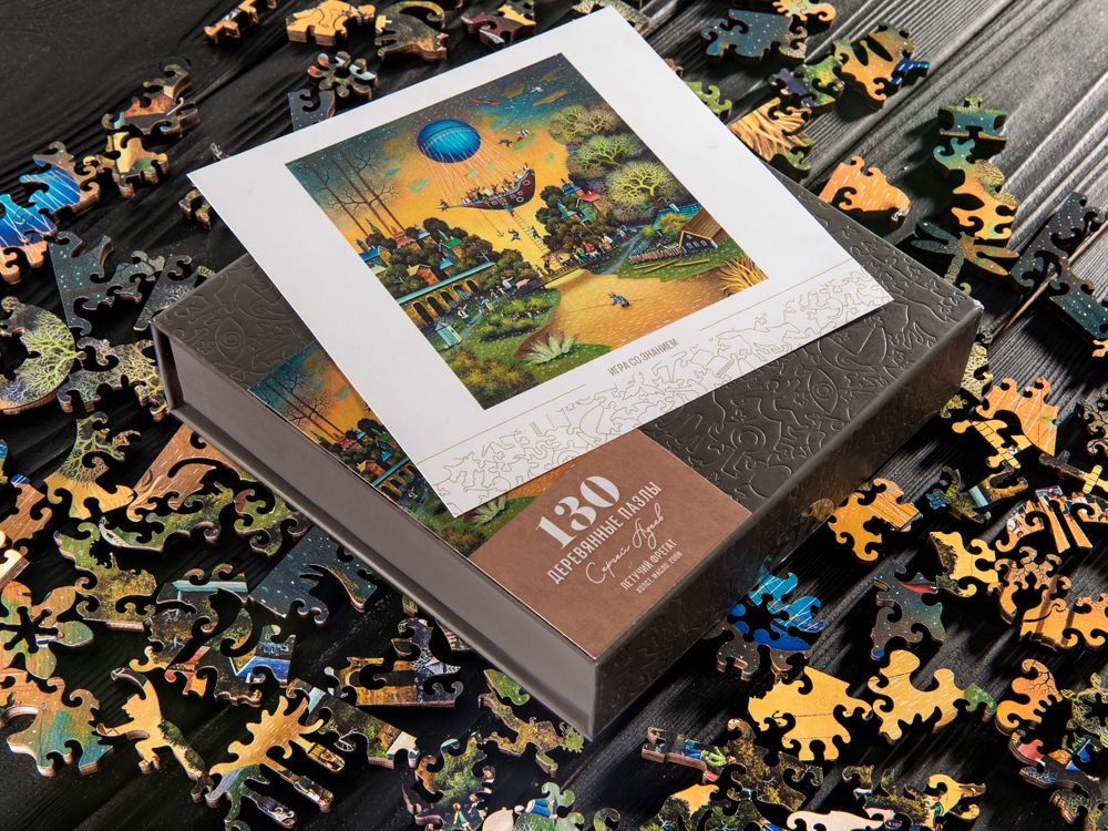 Головоломка поставляется в сером футляре из дизайнерского картона с магнитным замком, который можно брендировать вашим логотипом. Крышка футляра снабжена наклейкой с изображением картины для облегчения сборки.