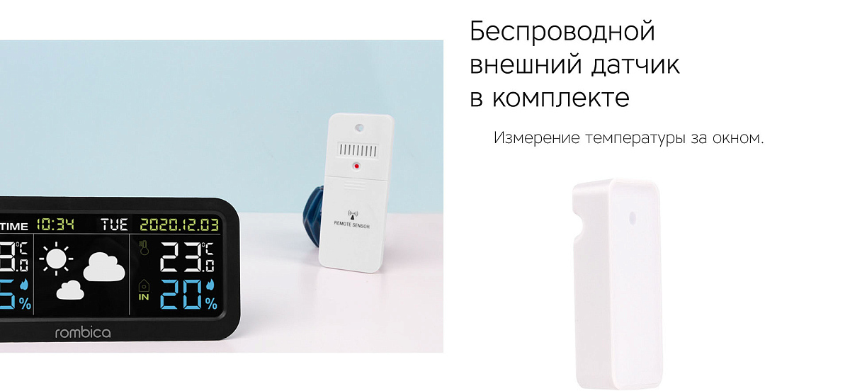 Особенности: часы; будильник; цветной дисплей; измерение температуры и влажности в помещении и на улице; фиксация максимальной и минимальной температуры и влажности; беспроводной внешний датчик