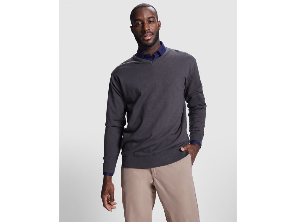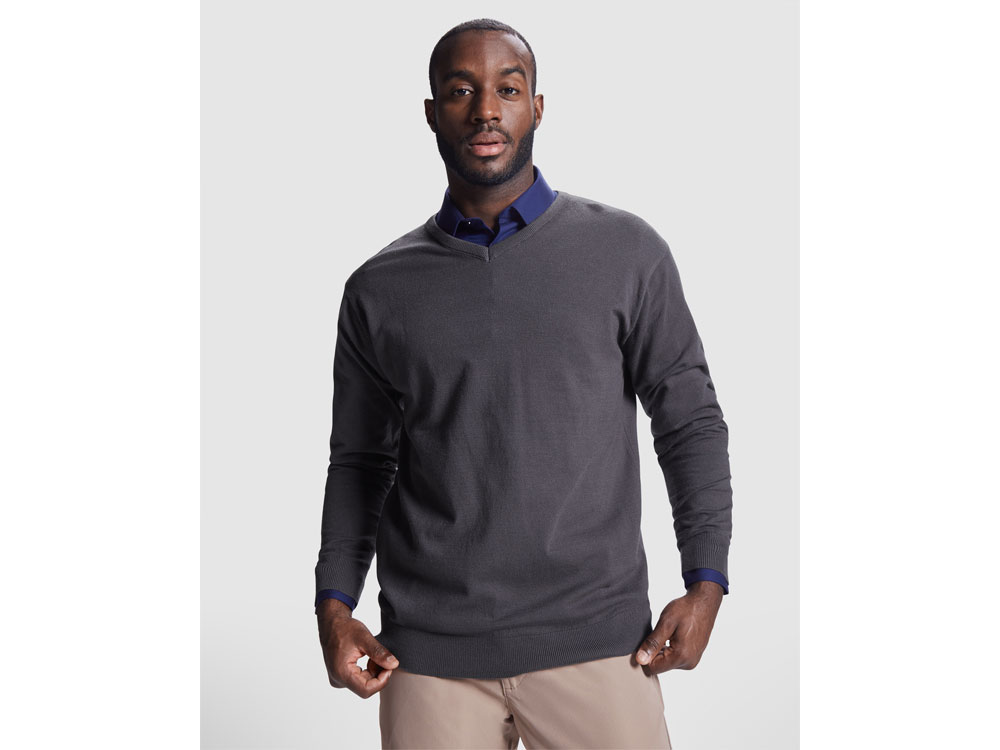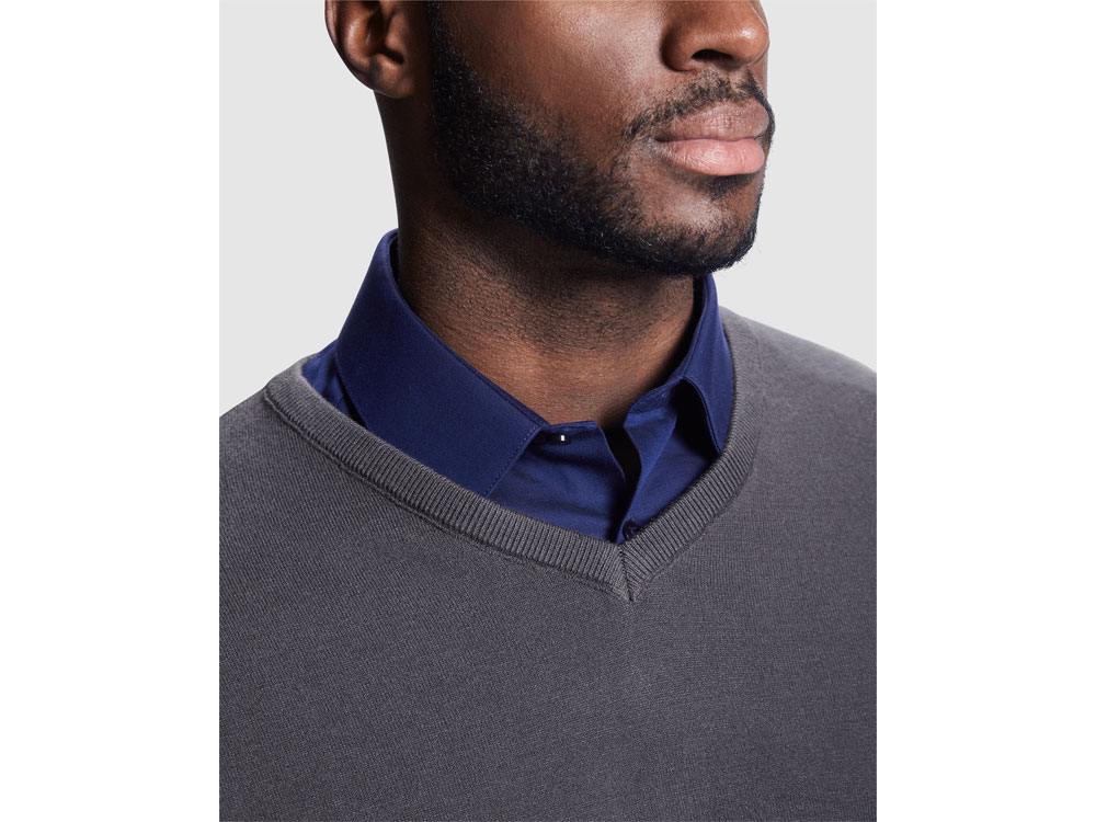 Джемпер c V вырезом тонкой вязки для мужчин. Отделка рибом 1х1 по горловине, низу и манжетам