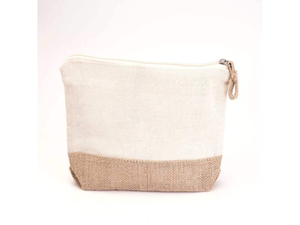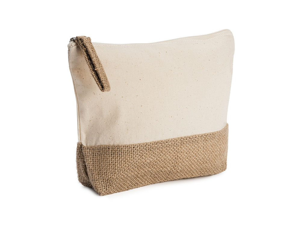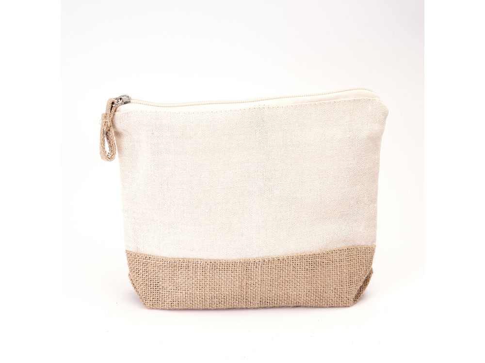 Эко-косметичка из хлопка и джута плотностью 180 г/м² натурального цвета с нижней частью и язычком из джута и застежкой-молнией в тон.