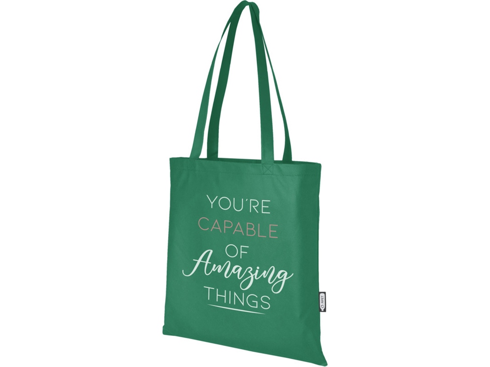 Большая эко-сумка Zeus из переработанных материалов, сертифицированных GRS, изготовленная из прочного и устойчивого к разрыву переработанного PET-пластика, является идеальным и более экологичным вариантом для ярмарок или конференций. Тонкий дизайн делает эту модель элегантной и подходящей для ношения легких предметов, например, блокнота и ручки. Ручки имеют длину 29 см, поэтому эко-сумку легко носить через плечо. Прочность до 5 кг. GRS certified recycled polyester, 80 g/m2.