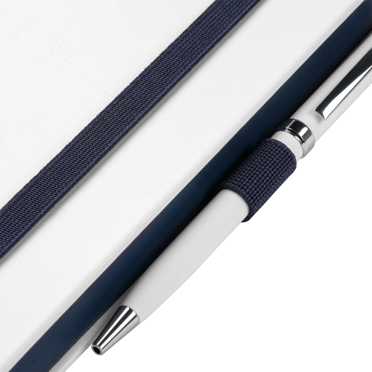 Недатированный ежедневник выполнен в жесткой обложке из искусственной кожи со скругленными уголками. Переплетный материал гладкий, с легкой естественной паутинкой морщин, имеет полуглянцевый блеск. Цвет – чистый белый. Черные матовые форзац и нахзац, а также черный срез блока создают оригинальный динамичный цветовой ансамбль и подчеркивают белизну обложки. Страницы светло-кремового цвета, из гладкого офсета, слегка шелковистые, со скругленными уголками. Добавляют изделию мягкую комфортную теплоту. Двойное атласное ляссе составлено из черной и белой лент. Каждая шириной 6 мм, имеет легкий блеск. Вертикальная фиксирующая резинка прочная, надежная и удобная, в тон срезу. Есть петелька для ручки в тон резинки. Карман на заднем форзаце.