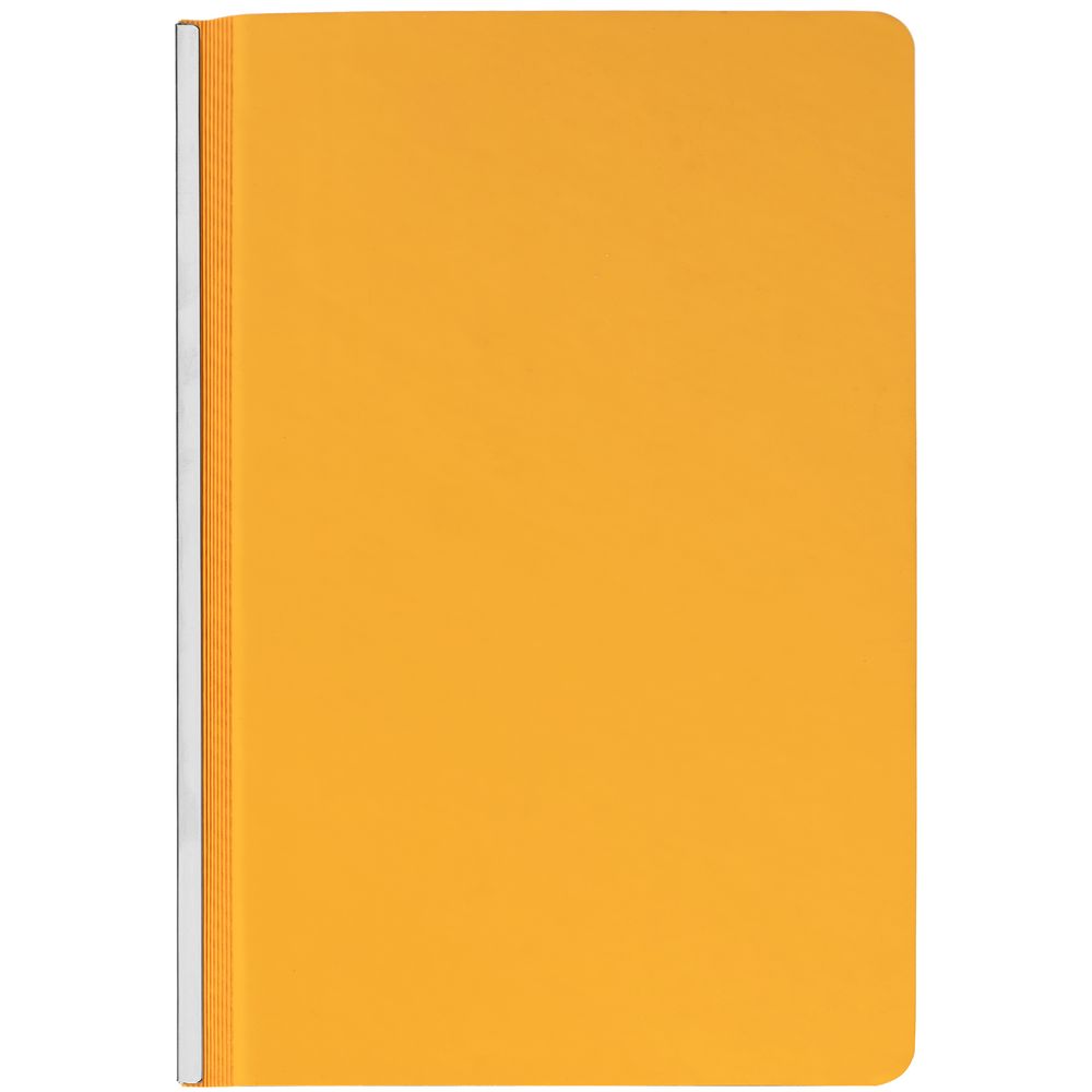 Ежедневник с гибкой обложкой и металлическим корешком, выполнен из материала Soft Touch, желтый КК, дополнен серебристым обрезом блока и ляссе.
