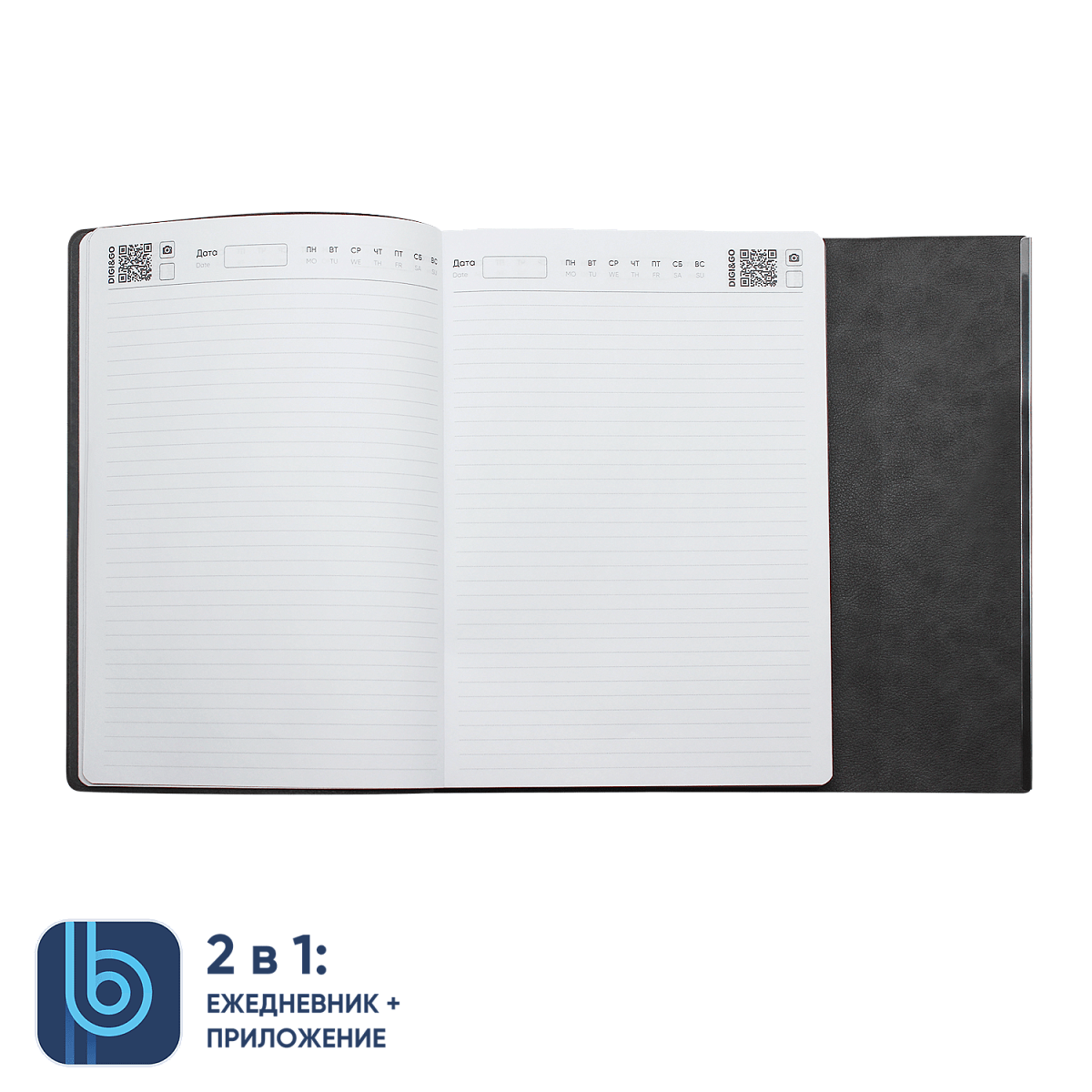 DIGI – фотоснимок страницы ежедневника. На каждой странице ежедневника расположен QR код, который открывает режим камеры сразу в приложении. Остается только нажать кнопку.