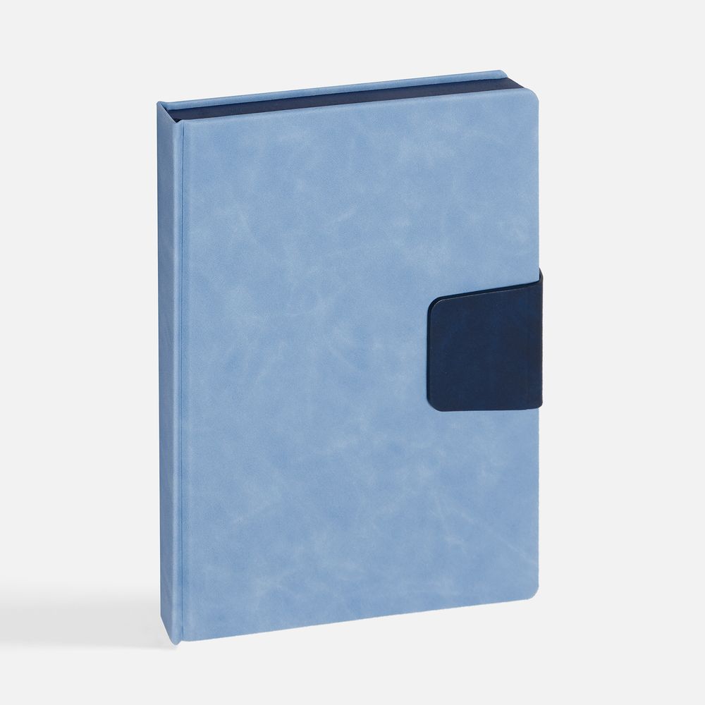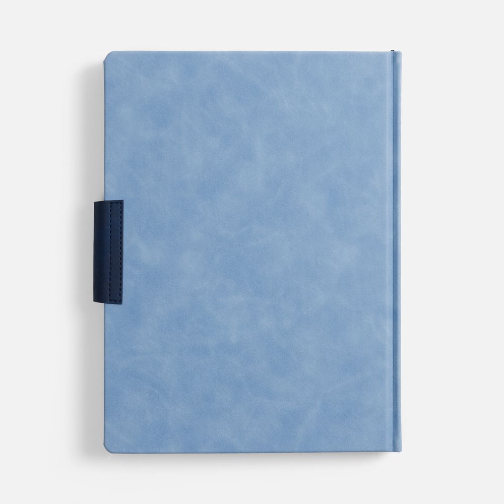 Ежедневник с твердой обложкой, выполнен из материала Nubuck Touch, голубой JJ, дополнен капталом, ляссе и обрезом синего цвета. Застежка — хлястик на магните из материала Nubuck Touch, темно-синий ХХ.