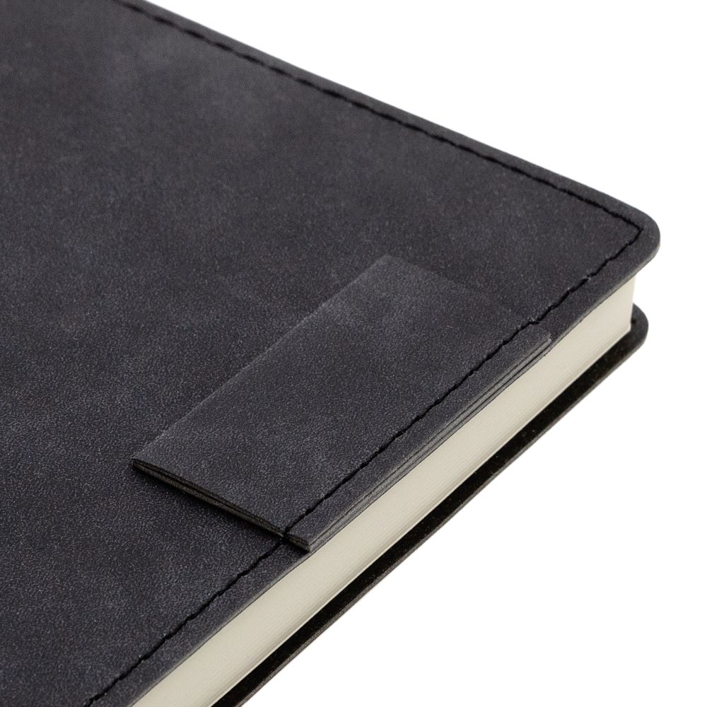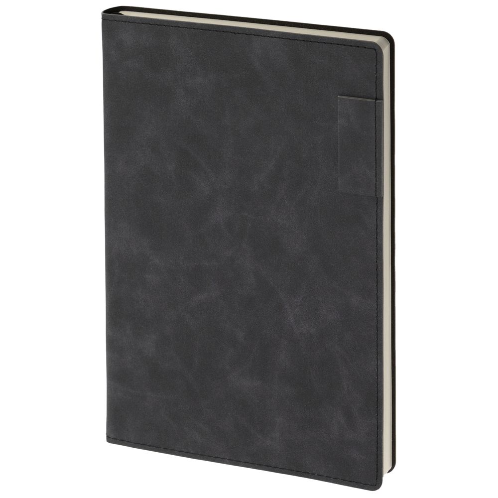 Ежедневник 17х24 см, с гибкой обложкой, выполнен из материала Nubuck Touch, темно-серый ЕЕ, дополнен петлей-лейблом для ручки и двойным ляссе в цвет материала.