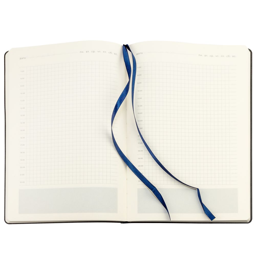 Ежедневник 17х24 см, с гибкой обложкой, выполнен из материала Nubuck Touch, темно-серый ЕЕ, дополнен петлей-лейблом для ручки и двойным ляссе в цвет материала.