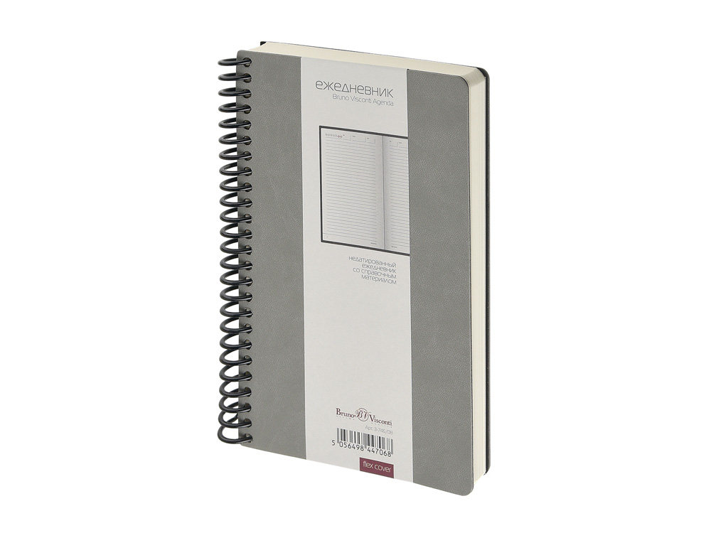 Недатированный деловой ежедневник Agenda формата A5 – практичное решение для любителей ежедневника на пружине. Открытый гребень позволяет переворачивать страницы на 360 градусов, держать его открытым на столе, комфортно вести записи. Обложка из искусственной кожи гибкая (flex). Внутренний блок ежедневника изготовлен из высококачественной бежевой бумаги, обладающей плотностью 80 грамм. Ежедневник содержит страницы с личными данными и справочным материалом на 12 страницах (аэропорты Европы, часовые пояса, единицы измерения, скорость, давление, температура, штрихкоды, размеры одежды, энергетическая ценность продуктов, термины международной торговли, расход калорий, форматы бумаги, римские цифры, греческие буквы, знаки зодиака, международные праздники, полезные сайты для путешествий, допустимый уровень содержания алкоголя в крови при вождении, время распада алкоголя в крови, буквенные коды стран, Российские государственные праздники, религиозные праздники, цифровые коды субъектов, города-миллионники).
