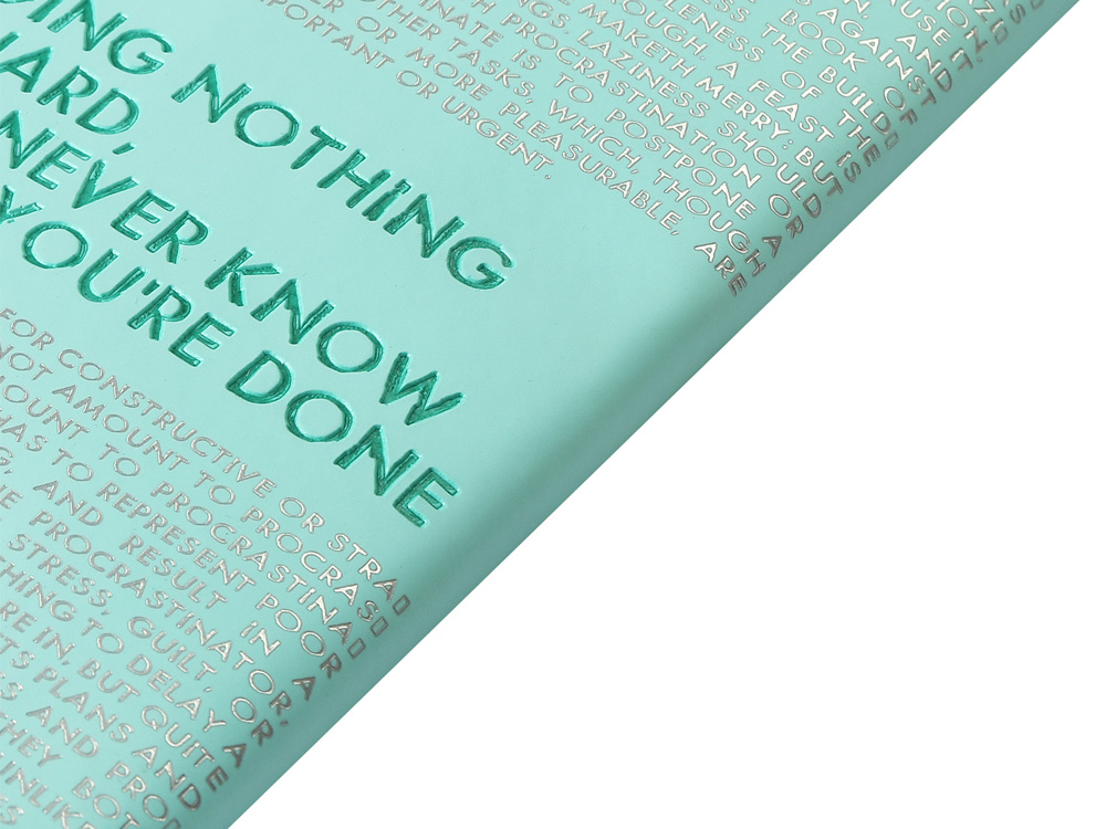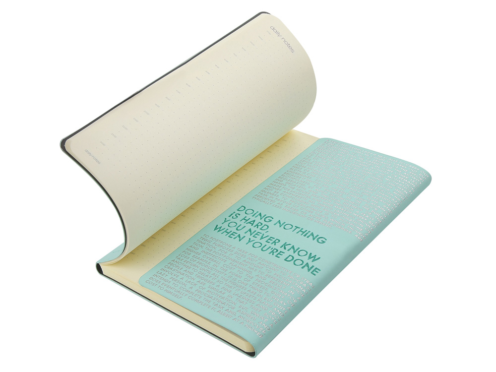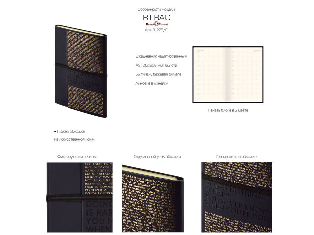 Так трудно ничего не делать, ведь совершенно непонятно, когда ты закончишь! Лаконичный слоган мотивирует к активным действиям. Планируй и завершай! Вот что кроется в элегантной надписи, выполненной золотым тиснением! А Flex обложка напоминает Будь гибким! Великолепный недатированный ежедневник Bilbao черно-синего цвета с тиснением фольгой. Бежевая бумага 65 г/м, широкая горизонтальная фиксирующая резинка. Гибкая обложка с покрытием Soft-touch. Особенность этого ежедневника - часть обложки внахлест может использоваться как закладка. Ежедневник упакован в картонный полукороб и термопленку.