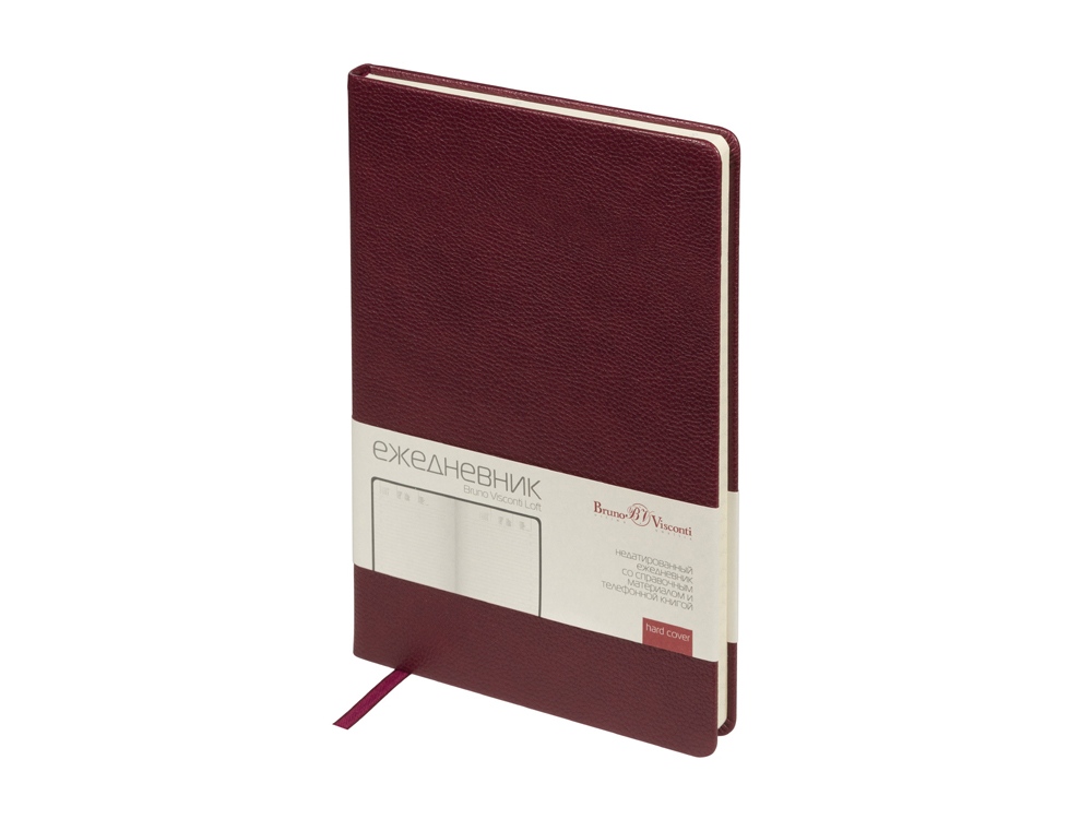 Недатированный ежедневник Loft формата А5 от Bruno Visconti - идеальный баланс между стилем и практичностью. Твердая обложка из высококачественной экокожи максимально повторяет фактуру натуральной кожи. Скругленные углы блока и обложки позволяют уберечь листы от замятий и придают ежедневнику утонченности и благородства. Для удобства навигации предусмотрена закладка-ляссе в цвет обложки. Внутренний блок ежедневника содержит справочную информацию и блок для ежедневного планирования в линейку с указанием времени суток (интервал в один час). Блок изготовлен из бежевой бумаги плотностью 70 г/кв.м.