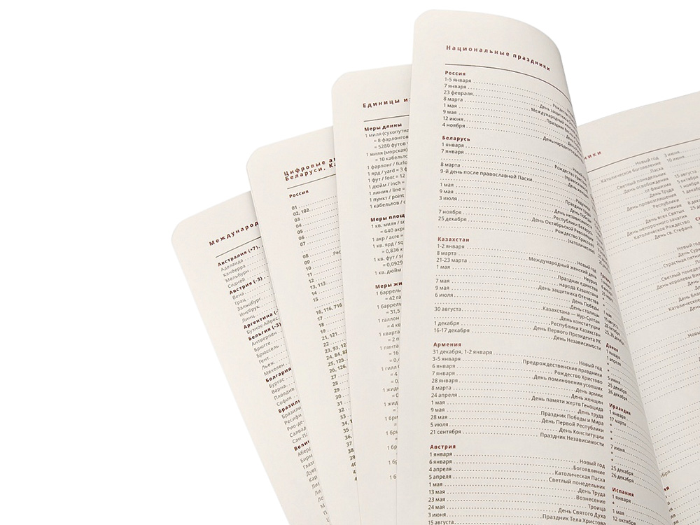 Недатированный ежедневник PARLIAMENT формата A5 в твердом переплете – элегантный деловой аксессуар, подчеркивающий статус владельца с продуманным до мелочей функционалом: - твердая обложка из высококачественной экокожи с декоративной нитью по периметру в тон ежедневника; - золотой срез, контрастирующий с цветом обложки; - скругленные перфорированные углы блока и двойное ляссе для удобства навигации; - внутренний блок с увеличенным количеством страниц - 352, содержит несколько разделов: - страница для персональных данных; - раздел справочной информации на 17 страницах (часовые пояса, аэропорты Европы, международные телефонные коды, размер одежды, телефонные коды России, Беларуси, Казахстана, Армении, цифровые автомобильные коды, римские цифры, расход калорий при физической нагрузке, формат бумаги, десятичные приставки, единицы измерения, греческие буквы, штрихкоды, время распада алкоголя в крови, города-миллионники, национальные праздники, термины международной торговли, температура, скорость, давление, буквенные коды стран, энергетическая и питательная ценность продуктов, страны мира, заметки); - раздел для планирования с разлинованными листами и указанием времени с интервалом в один час; - картонный слив-бокс.