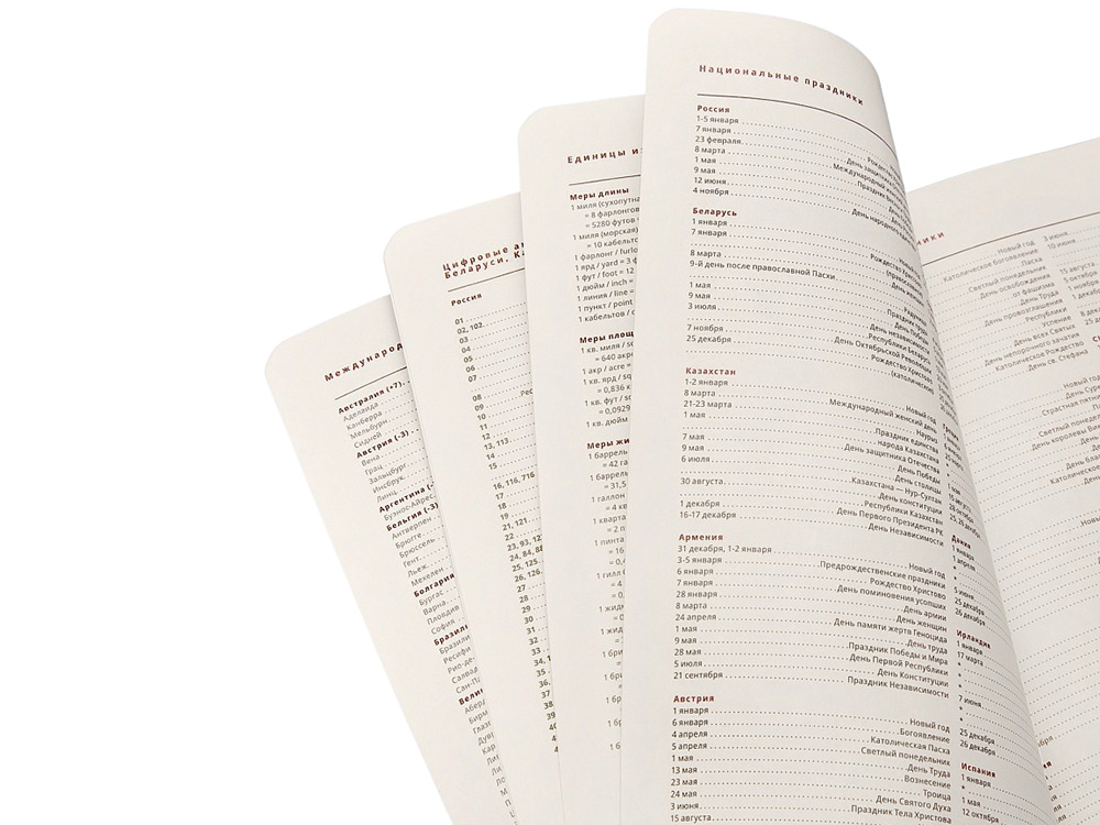 Недатированный ежедневник PARLIAMENT формата A5 в твердом переплете – элегантный деловой аксессуар, подчеркивающий статус владельца с продуманным до мелочей функционалом: - твердая обложка из высококачественной экокожи с декоративной нитью по периметру в тон ежедневника; - золотой срез, контрастирующий с цветом обложки; - скругленные перфорированные углы блока и двойное ляссе для удобства навигации; - внутренний блок с увеличенным количеством страниц - 352, содержит несколько разделов: - страница для персональных данных; - раздел справочной информации на 17 страницах (часовые пояса, аэропорты Европы, международные телефонные коды, размер одежды, телефонные коды России, Беларуси, Казахстана, Армении, цифровые автомобильные коды, римские цифры, расход калорий при физической нагрузке, формат бумаги, десятичные приставки, единицы измерения, греческие буквы, штрихкоды, время распада алкоголя в крови, города-миллионники, национальные праздники, термины международной торговли, температура, скорость, давление, буквенные коды стран, энергетическая и питательная ценность продуктов, страны мира, заметки); - раздел для планирования с разлинованными листами и указанием времени с интервалом в один час; - картонный слив-бокс.