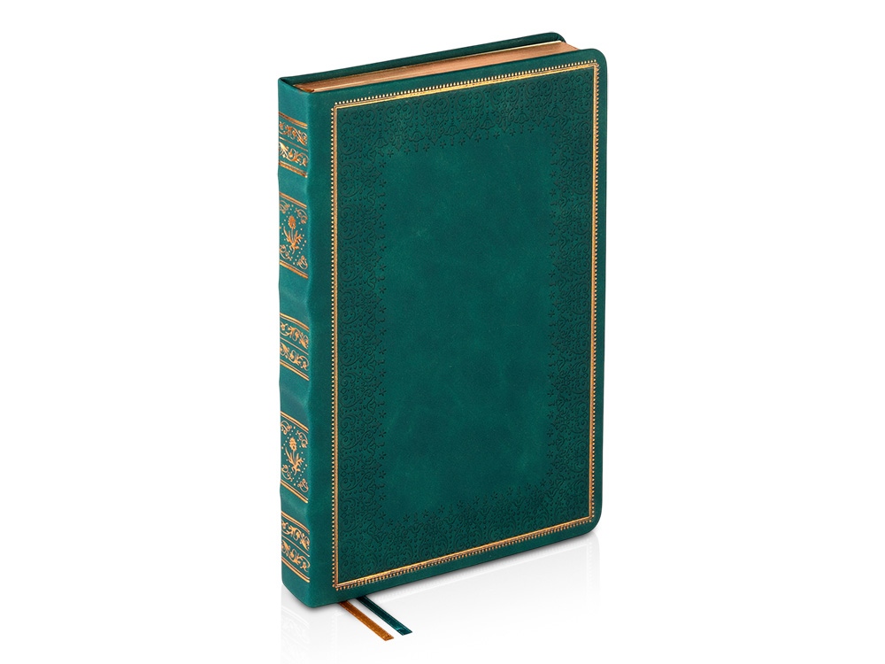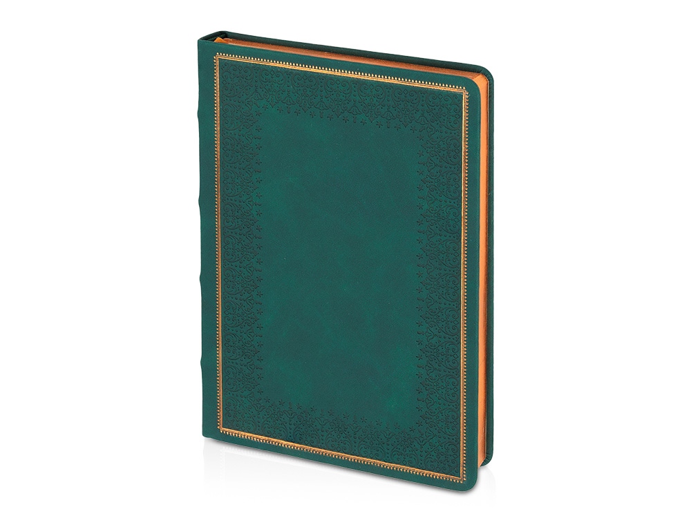 Недатированный ежедневник Royal формата А4 с твердой обложкой из искусственной кожи с имитацией нубука украшен художественным бронзовым и блинтовым тиснением. Внутри 192 страницы, выполненные из качественной бежевой бумаги в линейку плотностью 140 г/м². Два шелковых ляссе в цвет обреза блока и обложки облегчают навигацию по записям. Французский корешок дополнительно декорирован изящным бронзовым тиснением в виде виньеток. Скругленные углы обложки и блока подчеркивают стильный дизайн изделия, а блеск бронзового обреза дарит ежедневнику благородный и роскошный внешний вид.
