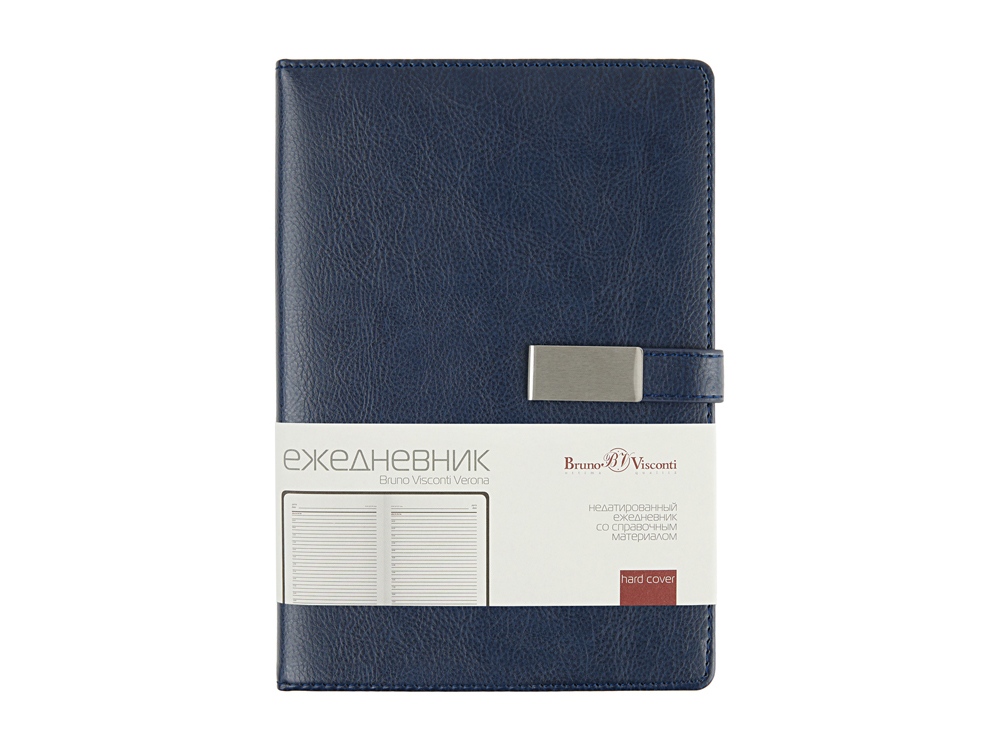Казалось бы, утилитарный ежедневник Verona формата А5 со стандартным набором характеристик: петля для руки, ляссе в цвет обложки, скругленные углы блока и обложки. Но благодаря маленькой детали - металлическому хлястику на магните, ежедневник выглядит ярко и привлекательно. Ежедневник комфортно и приятно держать в руках благодаря поролонированной обложке из высококачественной искусственной кожи. Блок из 256 страниц ежедневника произведен из бежевой бумаги плотностью 80 г/кв.м, содержит помимо недатированных страниц для планирования рабочего времени еще и справочную информацию.