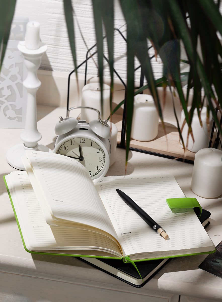 На лицевой стороне ежедневника предусмотрен карман для карт, записок, визиток. Чтобы заметки и записи были под контролем, а пользователь в любой момент мог внести новую информацию - у "Монти" предусмотрена петелька для ручки. Кроме того, ежедневник закрывается на магнитный хлястик.