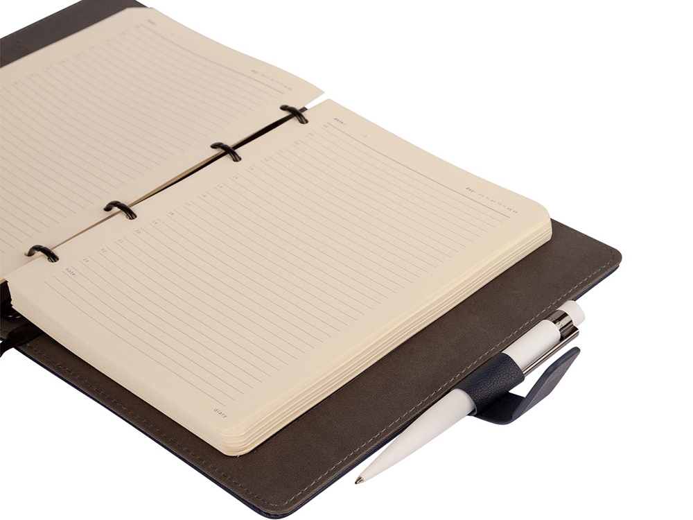 Недатированный ежедневник Toscana от Bruno Visconti на кольцах в твердом переплете – элегантный деловой аксессуар, подчеркивающий статус владельца с продуманным до мелочей функционалом: поролонированная обложка из высококачественной экокожи с декоративной нитью по периметру в тон ежедневника; бархатистая отделка, вырубка под пластиковые карты и визитки на внутренней стороне обложки; магнитный хлястик и петля для ручки; скругленные углы блока и обложки; ляссе с шильдиком для удобства навигации. Внутренний блок изготовлен из бумаги бежевого цвета и плотностью 70 г/кв.м и содержит 272 страницы, в т.ч. страницу для персональных данных, 17 страниц справочной информации.