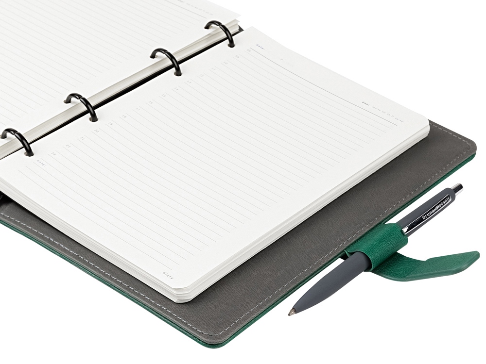 Недатированный ежедневник Toscana от Bruno Visconti на кольцах в твердом переплете – элегантный деловой аксессуар, подчеркивающий статус владельца с продуманным до мелочей функционалом: поролонированная обложка из высококачественной экокожи с декоративной нитью по периметру в тон ежедневника; бархатистая отделка, вырубка под пластиковые карты и визитки на внутренней стороне обложки; магнитный хлястик и петля для ручки; скругленные углы блока и обложки; ляссе с шильдиком для удобства навигации. Внутренний блок изготовлен из бумаги бежевого цвета и плотностью 70 г/кв.м и содержит 272 страницы, в т.ч. страницу для персональных данных, 17 страниц справочной информации.