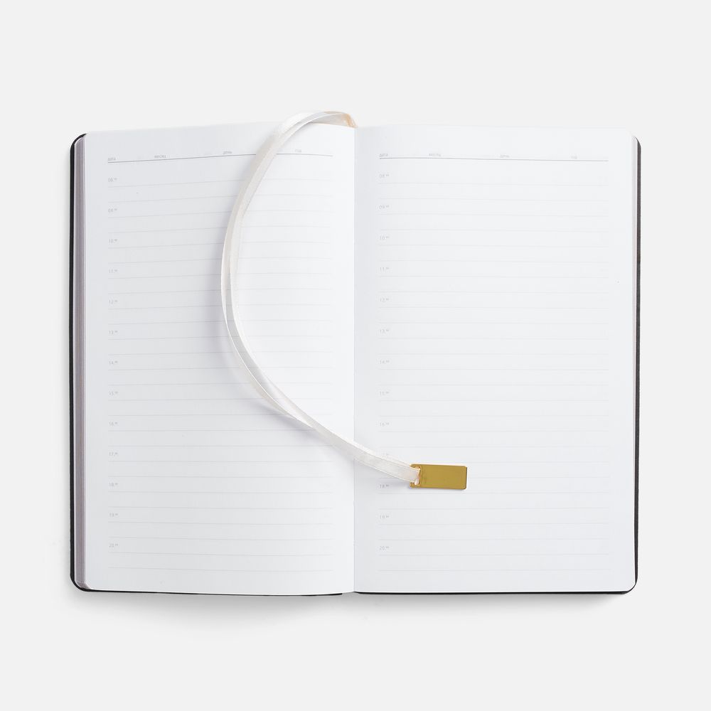 Ежедневник с гибкой обложкой, выполнен из материала Petrus, черный АА, дополнен серым ляссе с металлическим шильдиком.