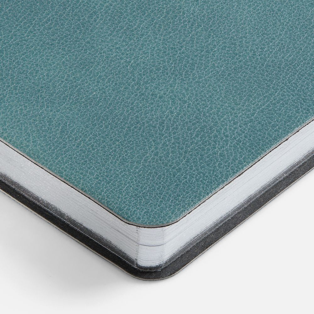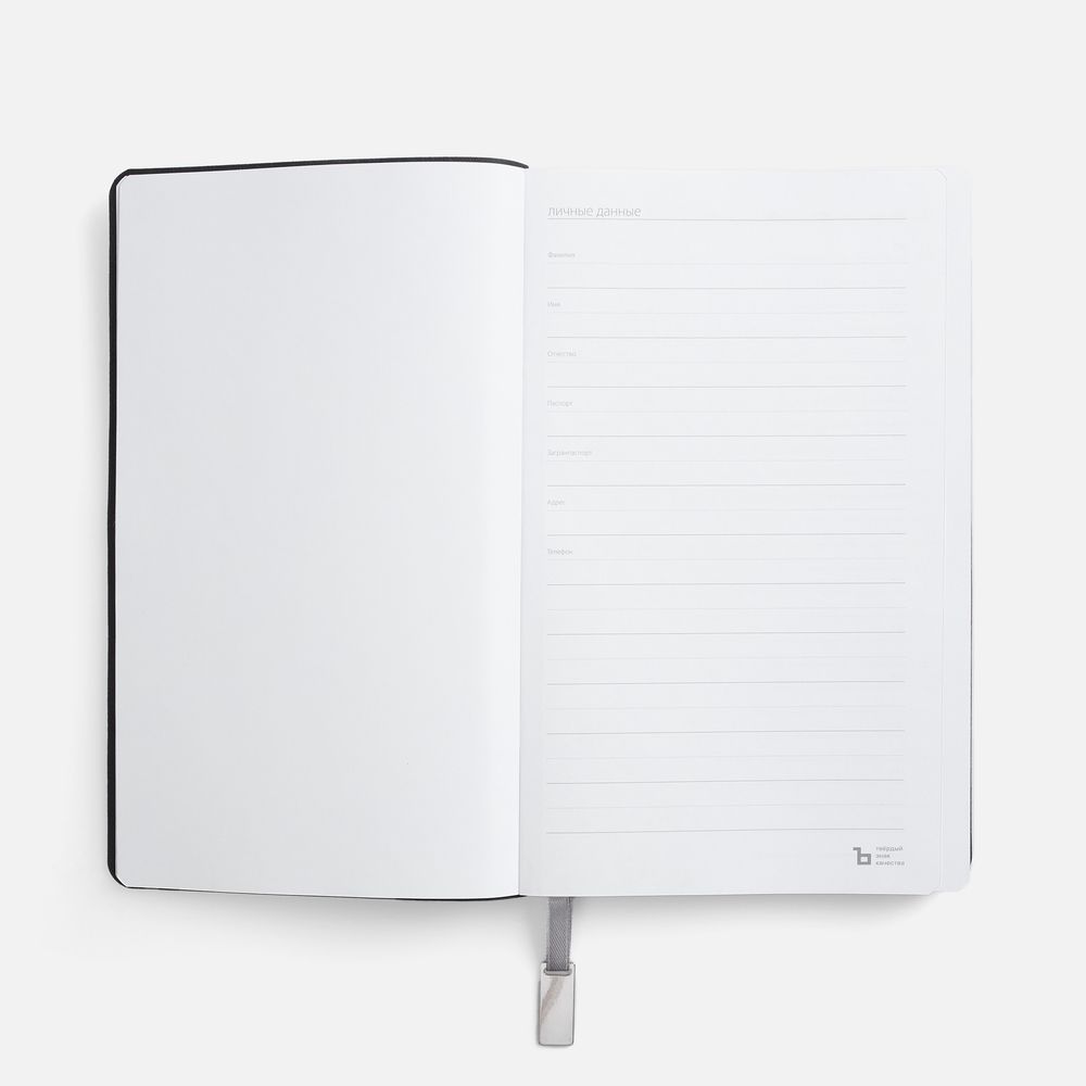 Ежедневник с гибкой обложкой, выполнен из материала Petrus, голубой JJ, дополнен серым ляссе с металлическим шильдиком.