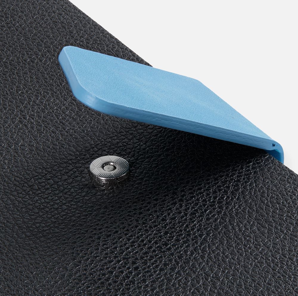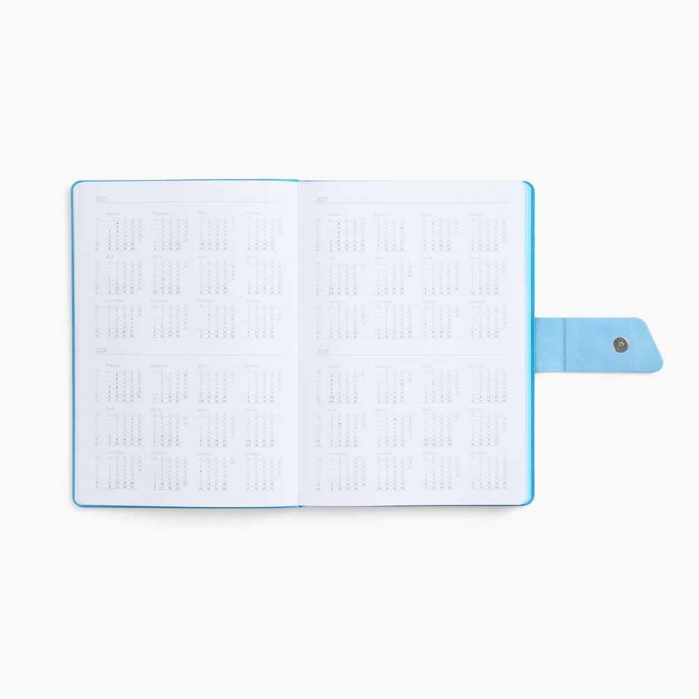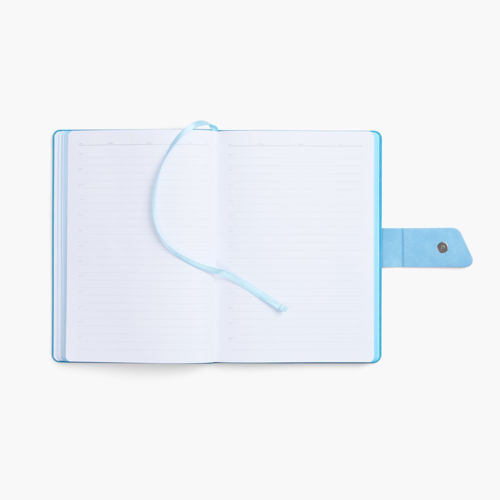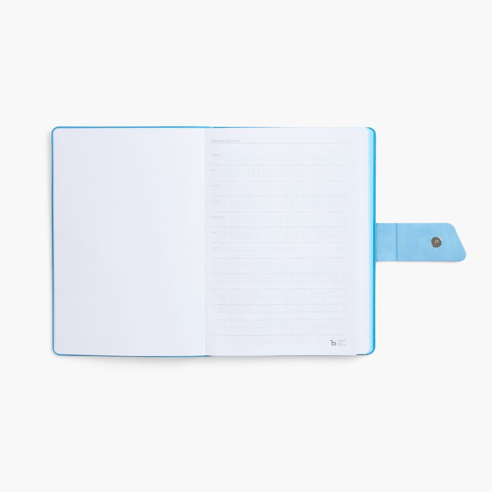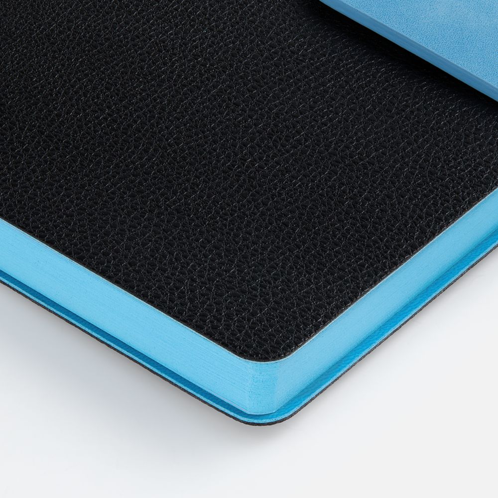 Ежедневник с гибкой обложкой, выполнен из материала La Fite, черный АА и Nubuck Touch, голубой, дополнен голубым ляссе и хлястиком на кнопке.