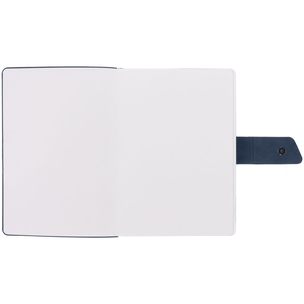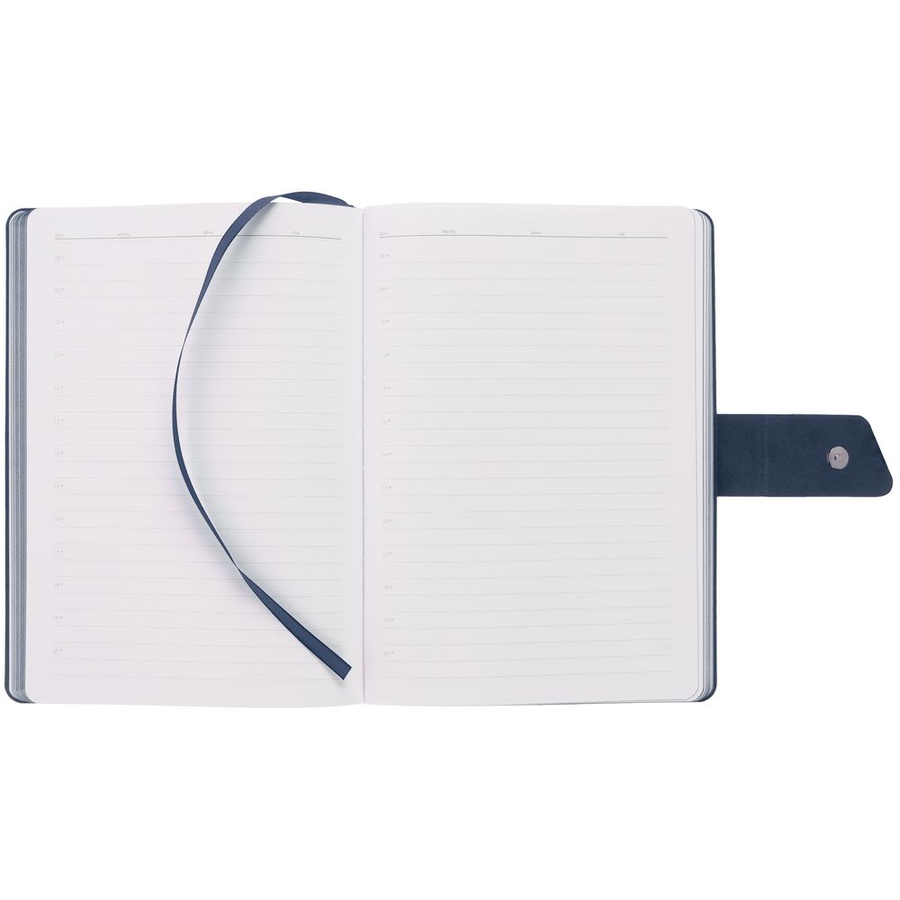 Ежедневник с гибкой обложкой, выполнен из материала La Fite, черный АА и Nubuck Touch, голубой, дополнен голубым ляссе и хлястиком на кнопке.