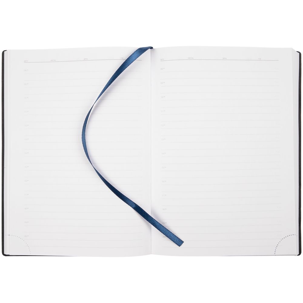 Ежедневник с гибкой обложкой выполнен из материала Latte, морская волна II, и дополнен резинкой шириной 1 см, капталом и ляссе в цвет обложки.
