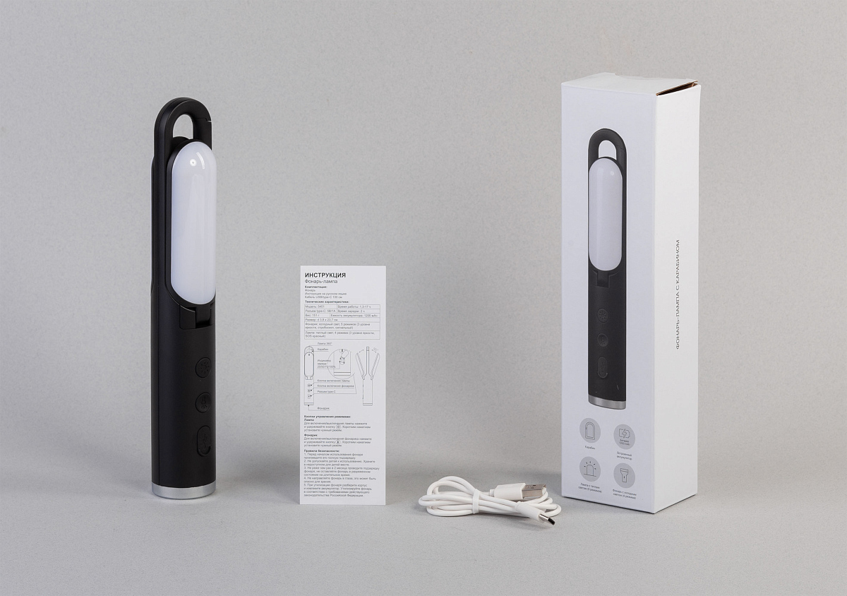 Лампа (169 лм) с теплым объемным светом 5 режимов, 2 сегмента с независимой регулировкой угла 0-90º. Фонарь (79 лм) с холодным светом 4 режима, направленный луч для построения маршрута. Встроенная батарея емкостью 1200 mAh, зарядка через разъем type-C, индикатор 25/50/75/100%.