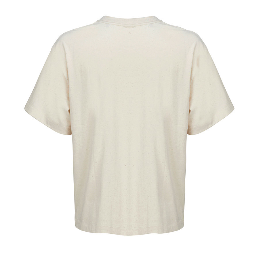 Футболка оверсайз унисекс с круглым вырезом, без боковых швов, высокой плотности. Выполнена из смеси переработанного хлопка (50%) и обычного хлопка (50%).