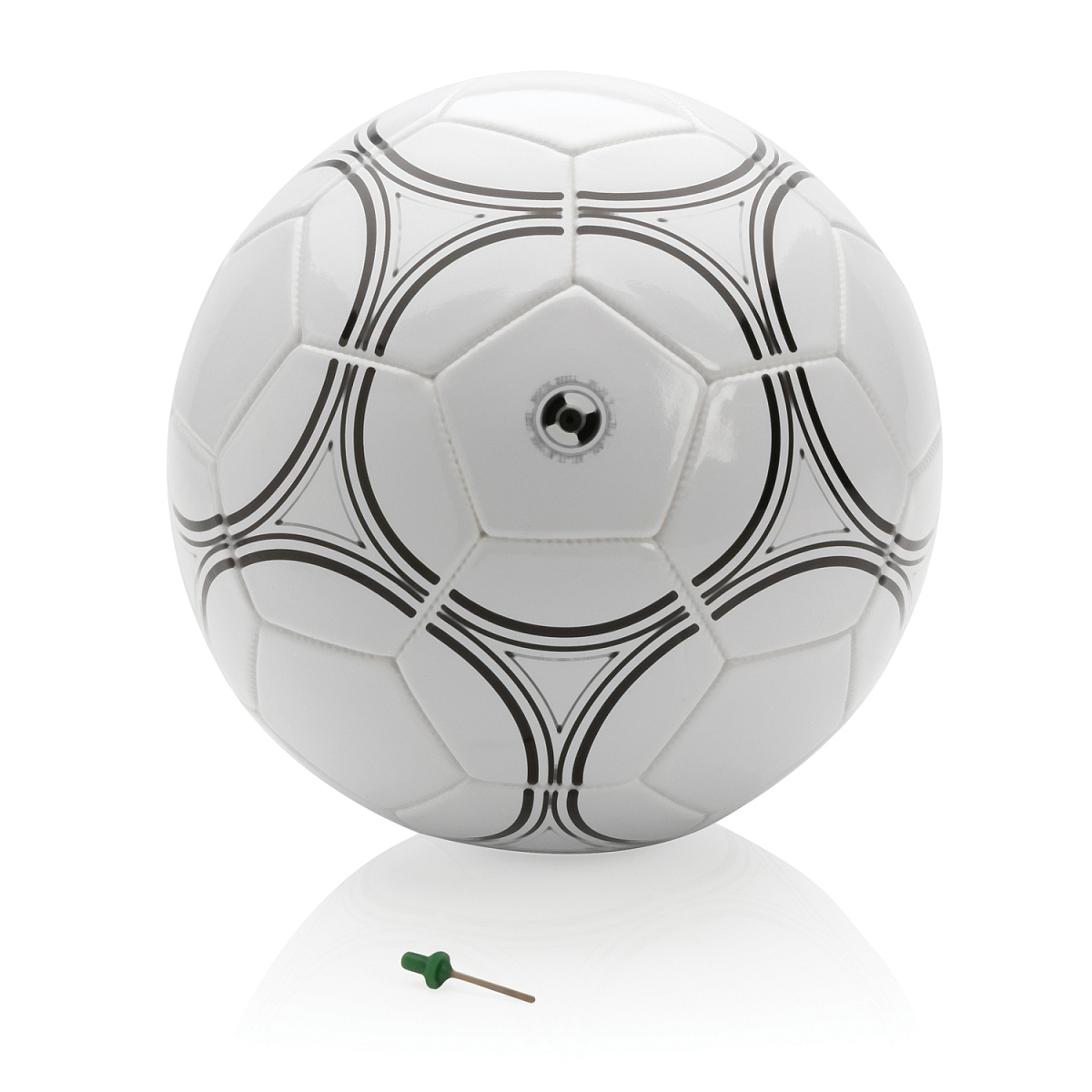 Футбольный мяч 5 размера выполнен из ПВХ и имеет два слоя. Поставляется с иглой для насоса. , высота 21,5 см., диаметр 21,5 см.