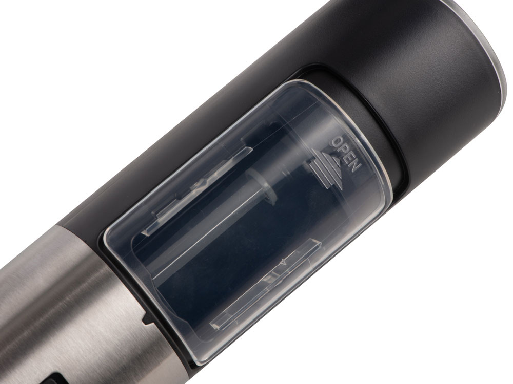 Мельница включается лишь в перевернутом положении, что позволяет снизить расход батареек и решает проблему случайного срабатывания устройства. Эргономичный корпус выполнен из нержавеющей стали и текстурного АБС-пластика.