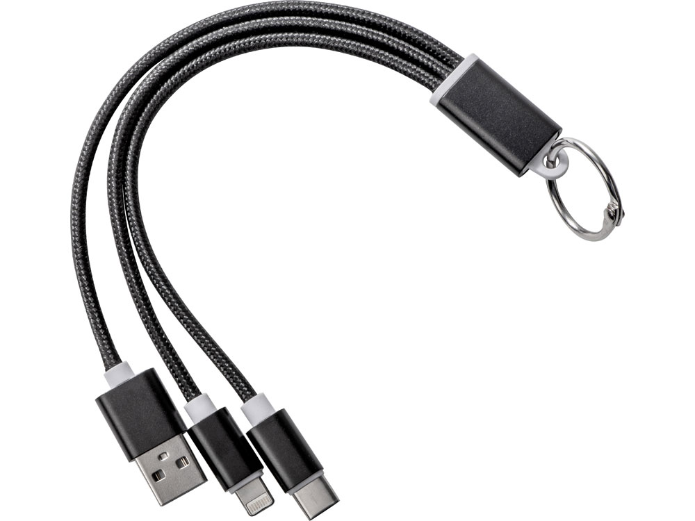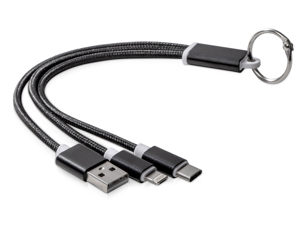 Кабель для зарядки Tres 3-в-1 с брелоком, коннекторами 1 type с, 1 USB type A и двойным совместимым коннектором 2-в-1 для устройств с ОС Apple® iOS и Android. В комплект входит брелок. Для зарядки устройств Apple подключайте кабель стороной без контактов; для зарядки устройств с ОС Android подключайте кабель стороной с контактами. Алюминий.