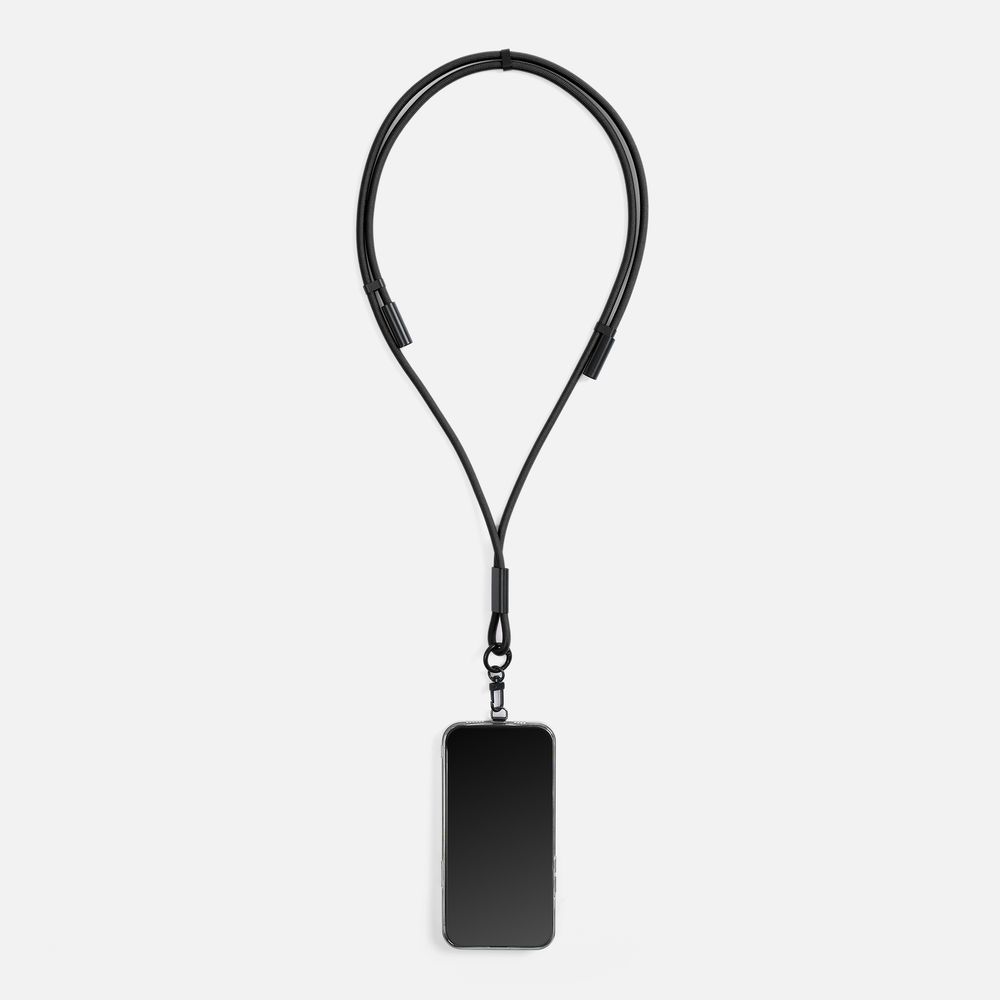 Важно: Для крепления телефона на ланьярд телефон должен иметь чехол. Если ланьярд распускается под тяжестью смартфона, убедитесь, что среднее из трех колец фурнитуры находится по центру ланьярда (на шее под затылком), а не сбоку. Соседние ветви оплетки должны идти вместе, без зазоров, так достигается трение ткани о ткань. Слишком тяжелые смартфоны (диагональ 6,9" и более) могут распускать ланьярд при энергичных движениях.