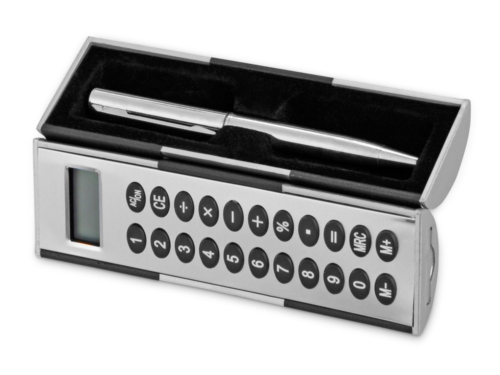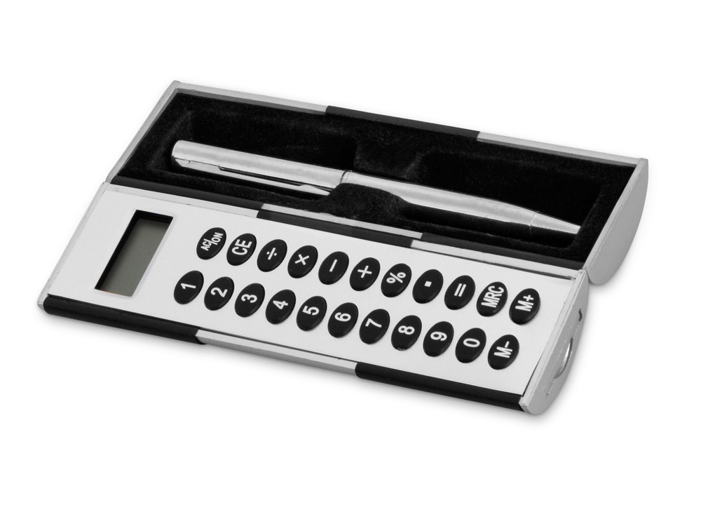 Калькулятор – футляр для ручки можно смело назвать магическим. Почему? Да потому что две его половинки вращаются на 360 градусов – одна вокруг другой, что очень удобно, ведь всегда можно удобно расположить и зафиксировать калькулятор перед собой. В комплект также входит шариковая ручка.
