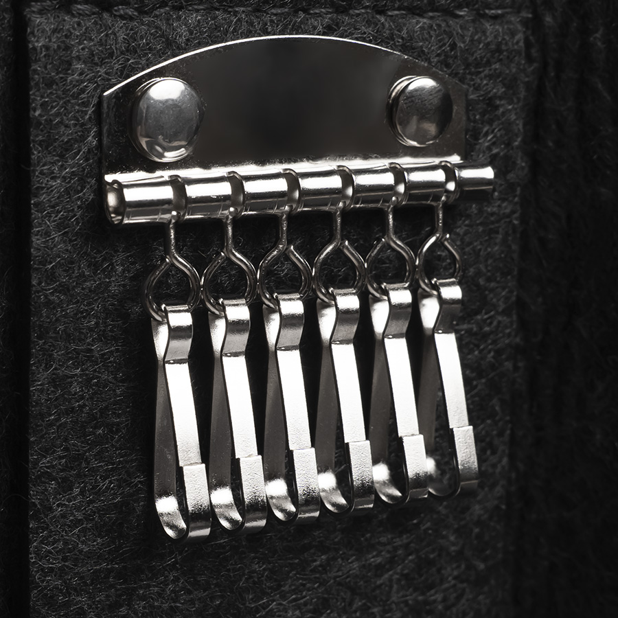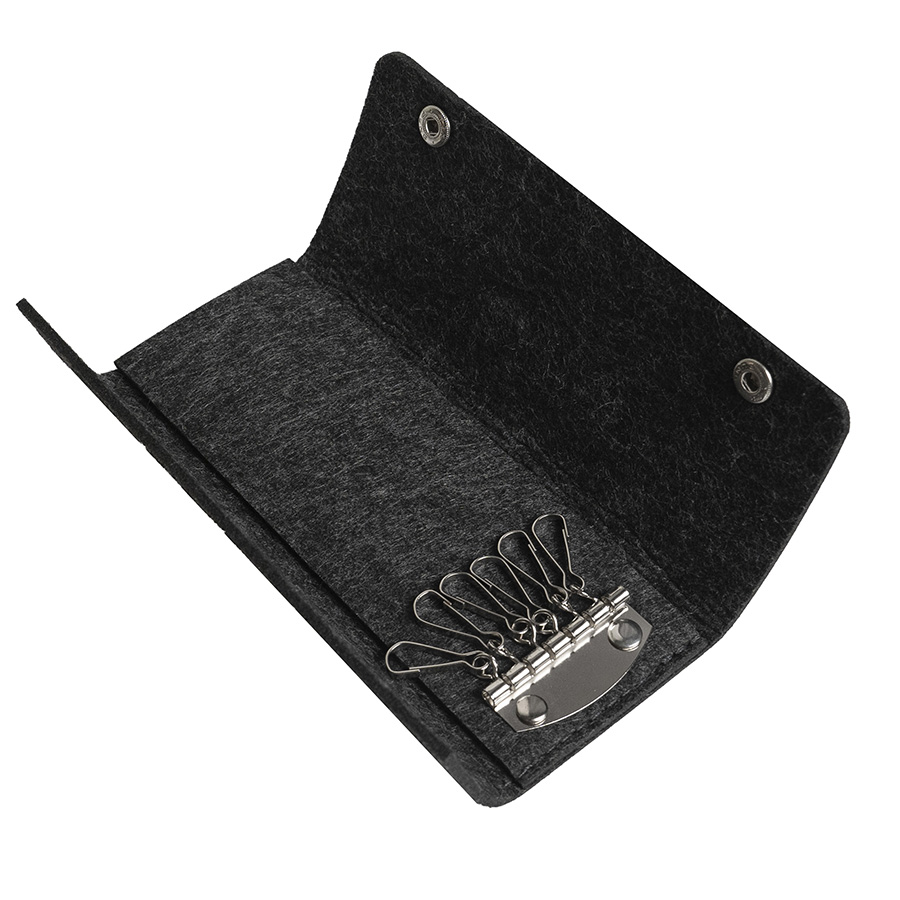 Ключница из RPET фетра на 2х кнопках-застежках. Внутри металлическая вставка на 6 ключей. Цвет темно-серый. Размер 10 х 17,3 см (20,3 х 17,3 в раскрытом виде). Плотность 3 мм. Виды нанесения: обычный трансфет и DTF.