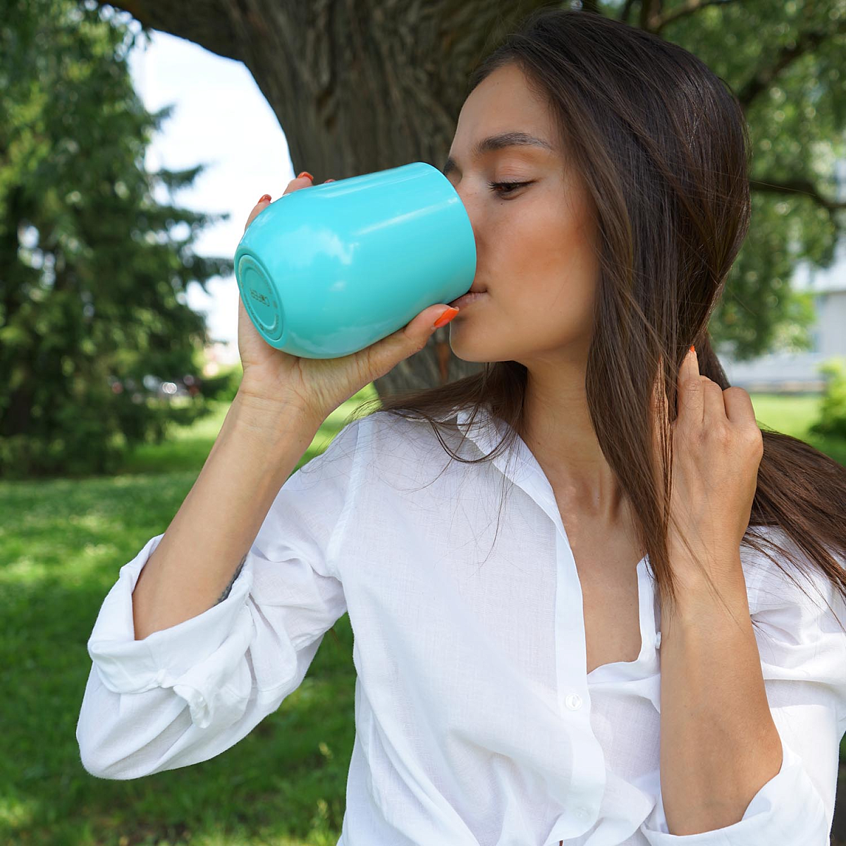 Характерная обтекаемая форма с расширяющейся нижней частью придает коферу оригинальность. Благодаря этой форме, кофер можно использовать для любых напитков: вода, чай, кофе, вино, коктейли - наливайте в кофер все, что захотите, напиток надолго сохранит свою температуру и вкус.