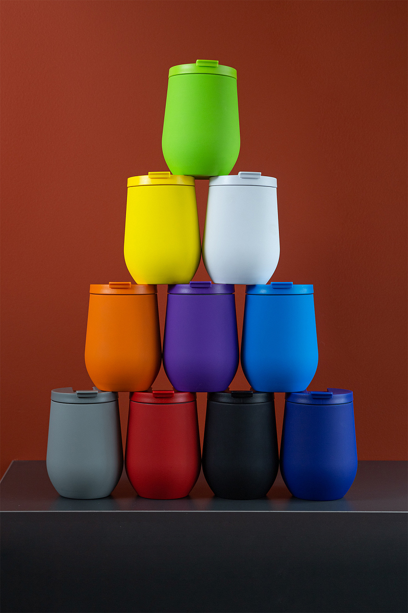 Характерная обтекаемая форма с расширяющейся нижней частью придает коферу оригинальность. Благодаря этой форме, кофер можно использовать для любых напитков: вода, чай, кофе, вино, коктейли - наливайте в кофер все, что захотите, напиток надолго сохранит свою температуру и вкус.