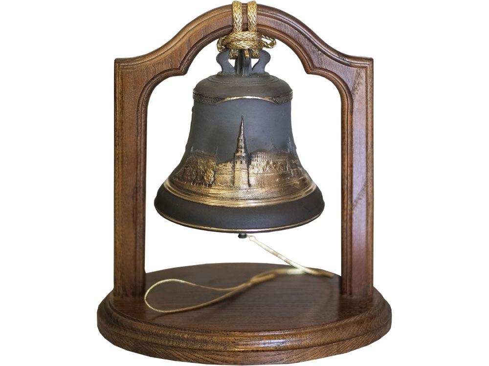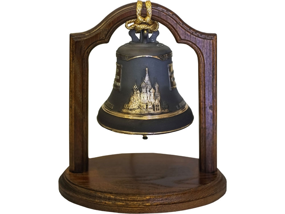 Колокол сувенирный весом 1кг Всея Руси на дубовой подставке. Поверхность колокола черненая с вызолочением.